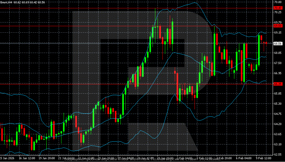 ในช่วงต้นเดือนกุมภาพันธ์ Brent พบแนวรับใกล้ระดับ 66.30 และเข้าสู่การเคลื่อนไหวแบบไซด์เวย์ ปัจจุบันราคากำลังแกว่งตัวในกรอบ 66.30–69.50 ใกล้กับเส้นกลางของ Bollinger Bands โครงสร้างราคาบ่งชี้ถึงช่วงการทรงตัวหลังการเคลื่อนไหวแบบเร่งตัว โดยมีความสมดุลระหว่างความพยายามฟื้นตัวและความเสี่ยงของการปรับฐานที่ลึกขึ้น