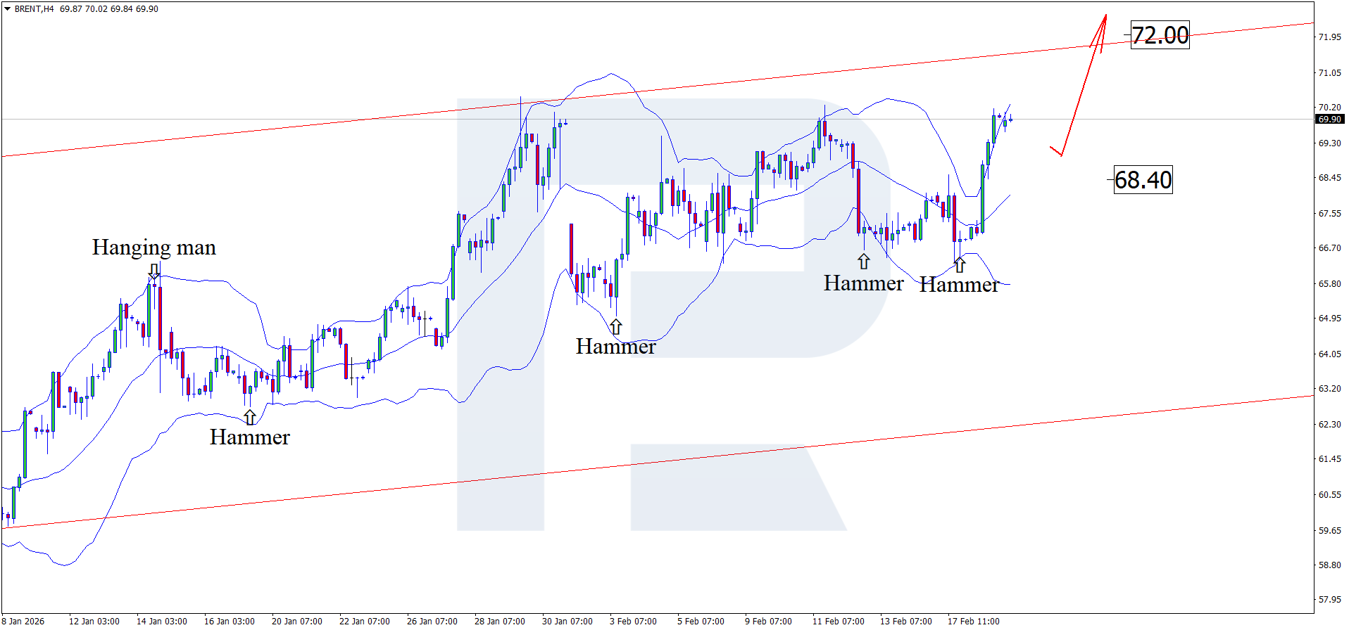 การวิเคราะห์ปัจจัยพื้นฐานของ Brent สำหรับวันนี้, 19 กุมภาพันธ์ 2026 คำนึงถึงว่าหลังจากการปรับตัวขึ้นล่าสุด ราคากำลังก่อตัวเป็นช่วงปรับฐานและซื้อขายอยู่ใกล้ระดับ 70.00 USD ต่อบาร์เรล