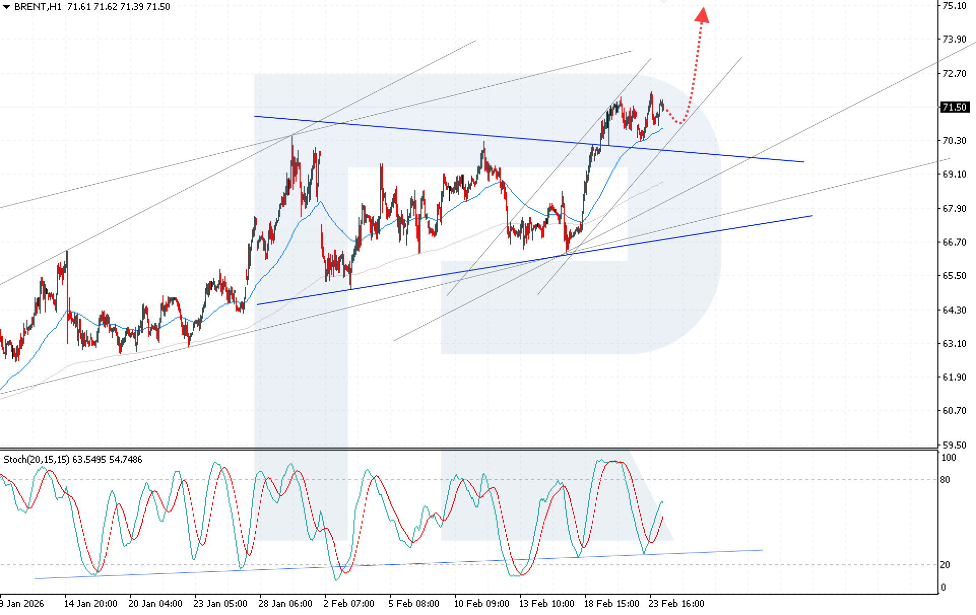ราคาน้ำมันดิบ Brent ยังคงปรับตัวขึ้นต่อเนื่อง ท่ามกลางความแข็งแกร่งทางเทคนิคและความตึงเครียดทางภูมิรัฐศาสตร์ที่ทวีความรุนแรง โดยปัจจุบันซื้อขายอยู่ที่ 71.50 USD ดูรายละเอียดเพิ่มเติมได้ในการวิเคราะห์ของเราสำหรับ 24 กุมภาพันธ์ 2026