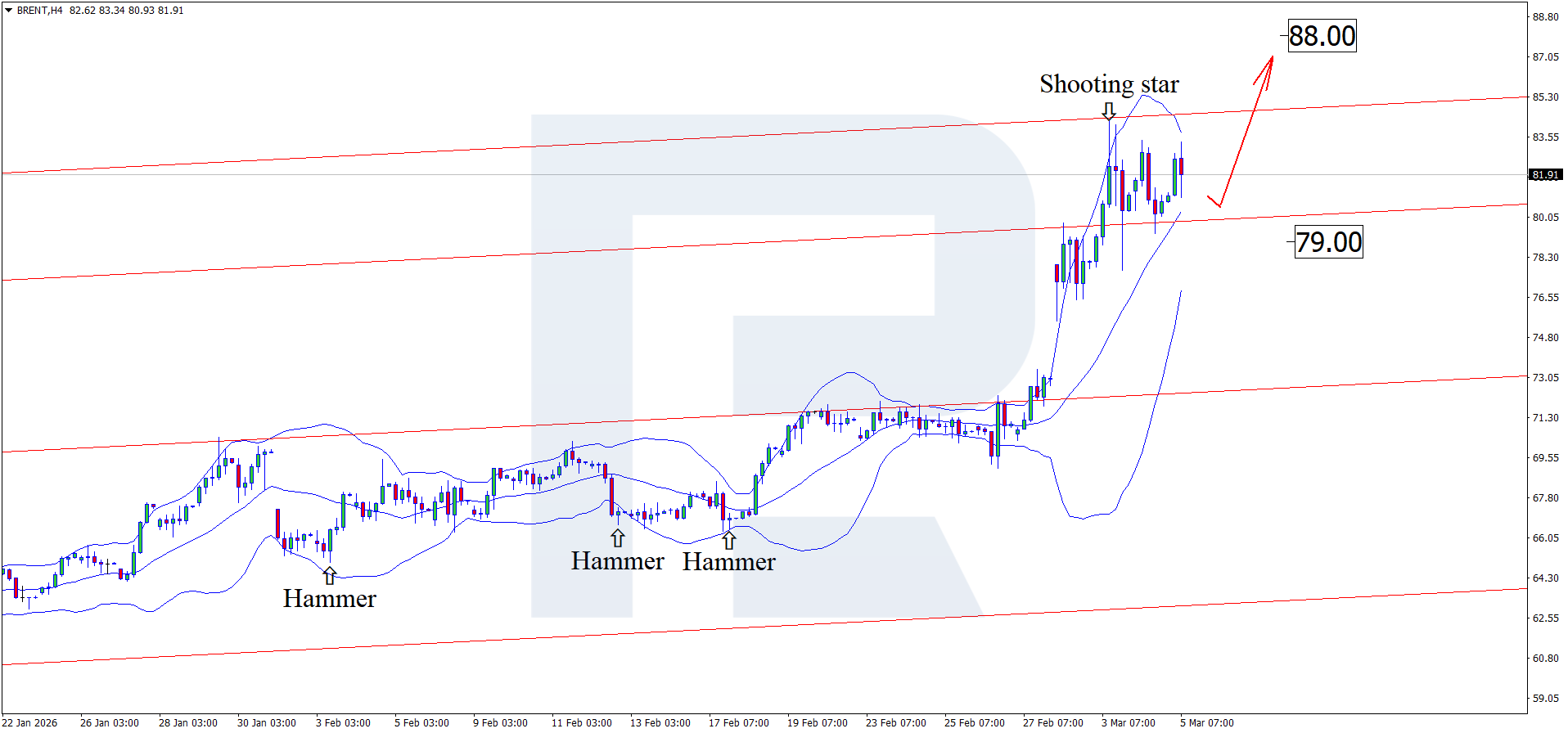 การวิเคราะห์พื้นฐานของ Brent สำหรับวันนี้ 5 มีนาคม 2026 พิจารณาว่าราคายังคงเคลื่อนไหวในทิศทางขาขึ้น โดยซื้อขายอยู่ราว 82.30 USD ต่อบาร์เรล