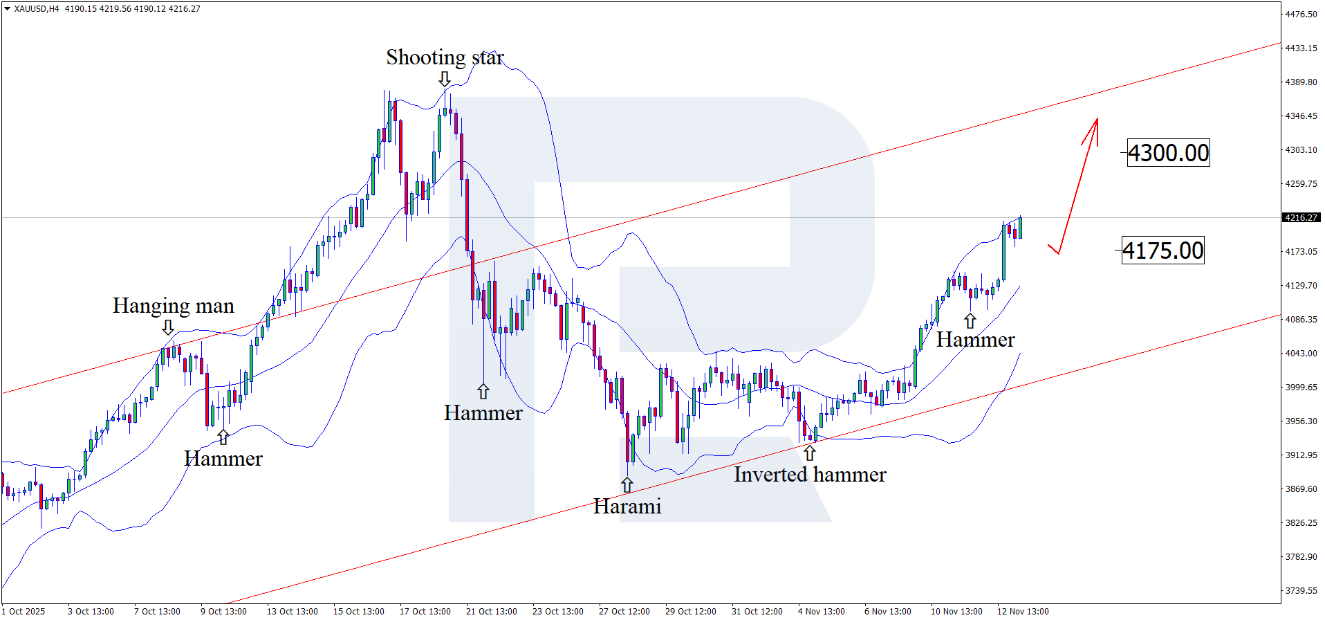 ในกราฟ H4 ราคาทองคำ XAUUSD ได้ก่อตัวแท่งเทียนกลับตัวแบบ Hammer ใกล้เส้นกลางของ Bollinger Band ราคาทองคำยังคงเคลื่อนไหวในคลื่นขาขึ้นตามสัญญาณจากรูปแบบดังกล่าว และเนื่องจากราคายังอยู่ภายในช่องแนวโน้มขาขึ้น เป้าหมายถัดไปอาจอยู่ที่ระดับ 4,300 ดอลลาร์