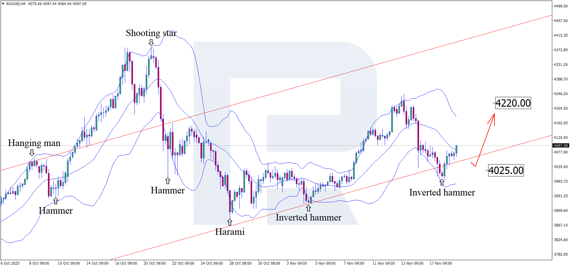 บนกราฟ H4 ราคาทองคำ XAUUSD ได้ก่อตัวแท่งเทียนกลับตัวแบบ Inverted Hammer ใกล้แถบล่างของ Bollinger และกำลังเดินหน้าต่อในทิศทางขาขึ้นตามสัญญาณดังกล่าว เนื่องจากราคายังคงเคลื่อนไหวภายในช่องขาขึ้น เป้าหมายด้านบนจึงอาจอยู่ที่ 4,220 ดอลลาร์