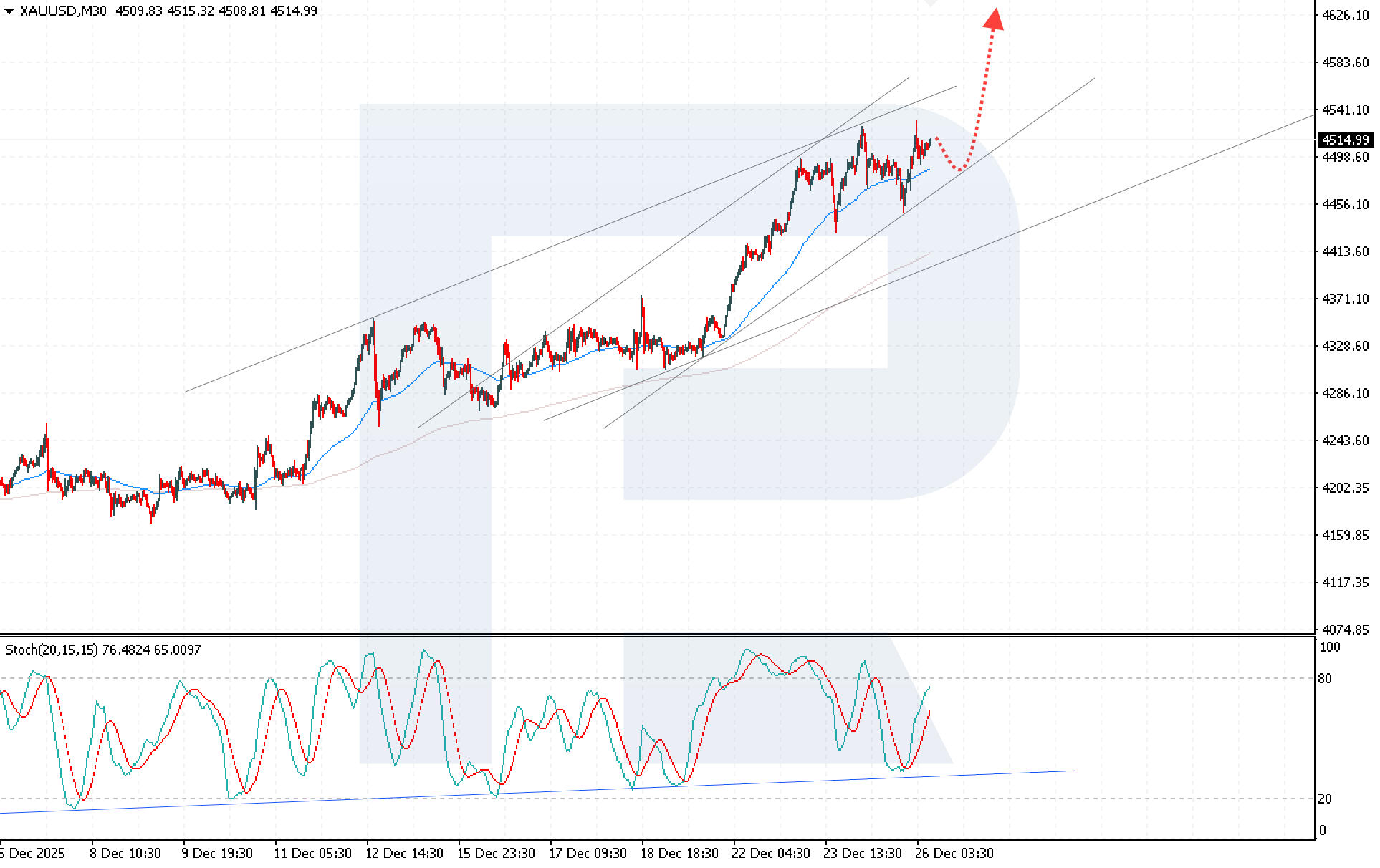 ราคา XAUUSD ยังคงได้รับแรงหนุนจากความเสี่ยงทางภูมิรัฐศาสตร์และความคาดหวังเกี่ยวกับการผ่อนคลายนโยบายการเงินของธนาคารกลางสหรัฐฯ ซึ่งยังคงสนับสนุนการปรับตัวขึ้นของราคา ปัจจุบันราคาอยู่ที่ 4,514 USD รายละเอียดเพิ่มเติม — ในบทวิเคราะห์ของเราสำหรับ 26 ธันวาคม 2025.