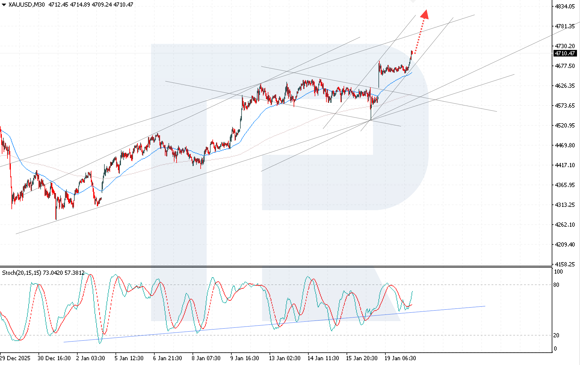 การปรับตัวขึ้นยังได้รับแรงหนุนจากการดีดตัวอย่างมั่นคงจากขอบล่างของกรอบขาขึ้น การยืนยันสำคัญของสถานการณ์ขาขึ้นจะเกิดขึ้นเมื่อราคา XAUUSD ยืนเหนือระดับ 4,785 USD ได้อย่างชัดเจน ซึ่งจะบ่งชี้ถึงการทะลุผ่านขอบบนของกรอบขาขึ้น ในกรณีนี้ ความเป็นไปได้ของการเคลื่อนไหวอย่างรวดเร็วไปยังระดับเป้าหมายจะเพิ่มสูงขึ้นอย่างมาก