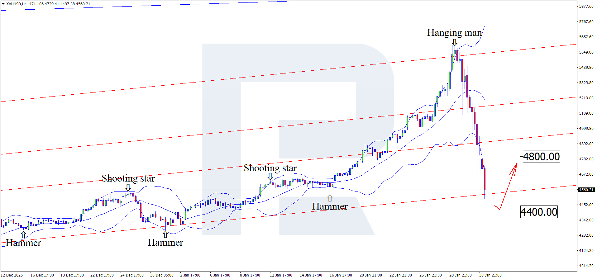 บนกราฟ H4 ราคาของ XAUUSD ได้ก่อตัวเป็นรูปแบบกลับตัว Hanging Man ใกล้ขอบบนของ Bollinger Band ในระยะนี้ ราคาได้พัฒนาคลื่นปรับฐานต่อเนื่องตามสัญญาณของรูปแบบดังกล่าว โดยเนื่องจากราคาปรับตัวกลับเข้ามาภายในกรอบขาขึ้น เป้าหมายด้านล่างของการย่อตัวอาจอยู่ที่แนวรับ 4,400 USD