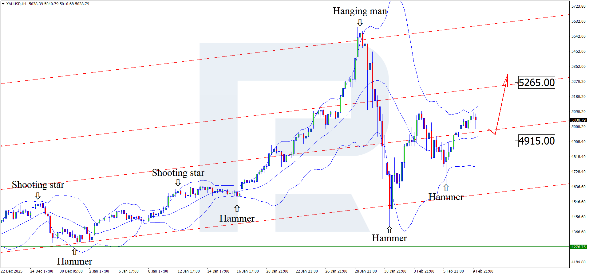 บนกราฟ H4 ราคาทองคำ XAUUSD ได้ก่อตัวเป็นรูปแบบกลับตัว Hammer ใกล้เส้น Bollinger Band ด้านล่าง และอาจปรับตัวขึ้นต่อเนื่องตามสัญญาณของรูปแบบดังกล่าว เนื่องจากราคายังคงเคลื่อนไหวภายในช่องขาขึ้น เป้าหมายด้านบนอาจอยู่ที่ระดับ 5,265 USD