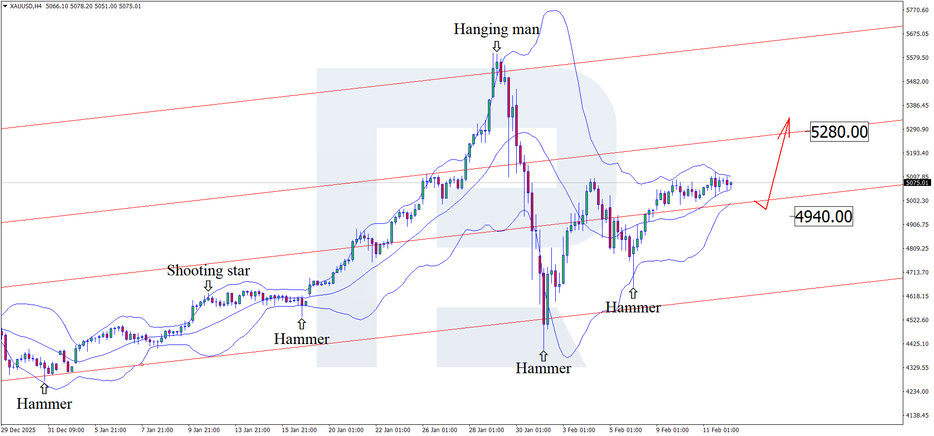 บนกราฟ H4 ราคา XAUUSD ก่อตัวเป็นรูปแบบกลับตัว Hammer ใกล้เส้น Bollinger Band ด้านล่าง และอาจปรับตัวขึ้นต่อเนื่องตามสัญญาณของรูปแบบดังกล่าว เนื่องจากราคายังคงเคลื่อนไหวภายในช่องขาขึ้น เป้าหมายถัดไปอาจอยู่ที่ 5,280 USD
