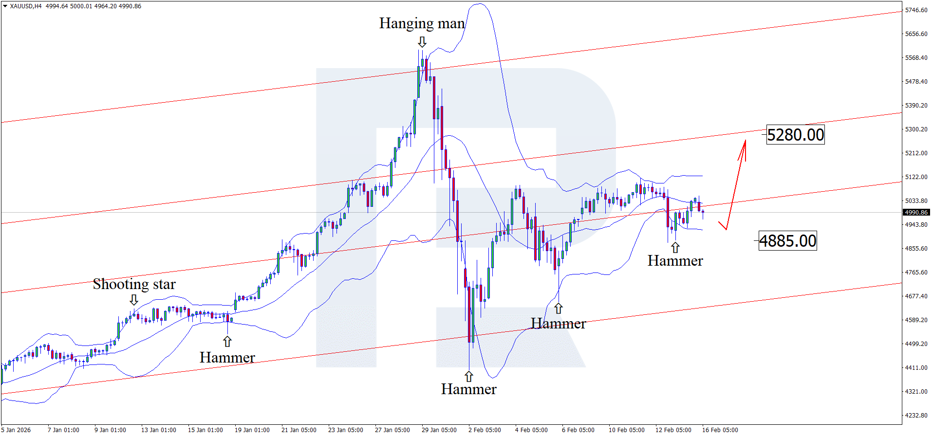 บนกราฟ H4 ราคาทองคำ (XAUUSD) ได้ก่อตัวรูปแบบกลับตัว Hammer ใกล้ขอบล่างของ Bollinger Band และอาจปรับตัวขึ้นต่อจากสัญญาณดังกล่าว เนื่องจากราคายังคงเคลื่อนไหวอยู่ภายในช่องขาขึ้น เป้าหมายขาขึ้นอาจอยู่ที่ 5,280 USD