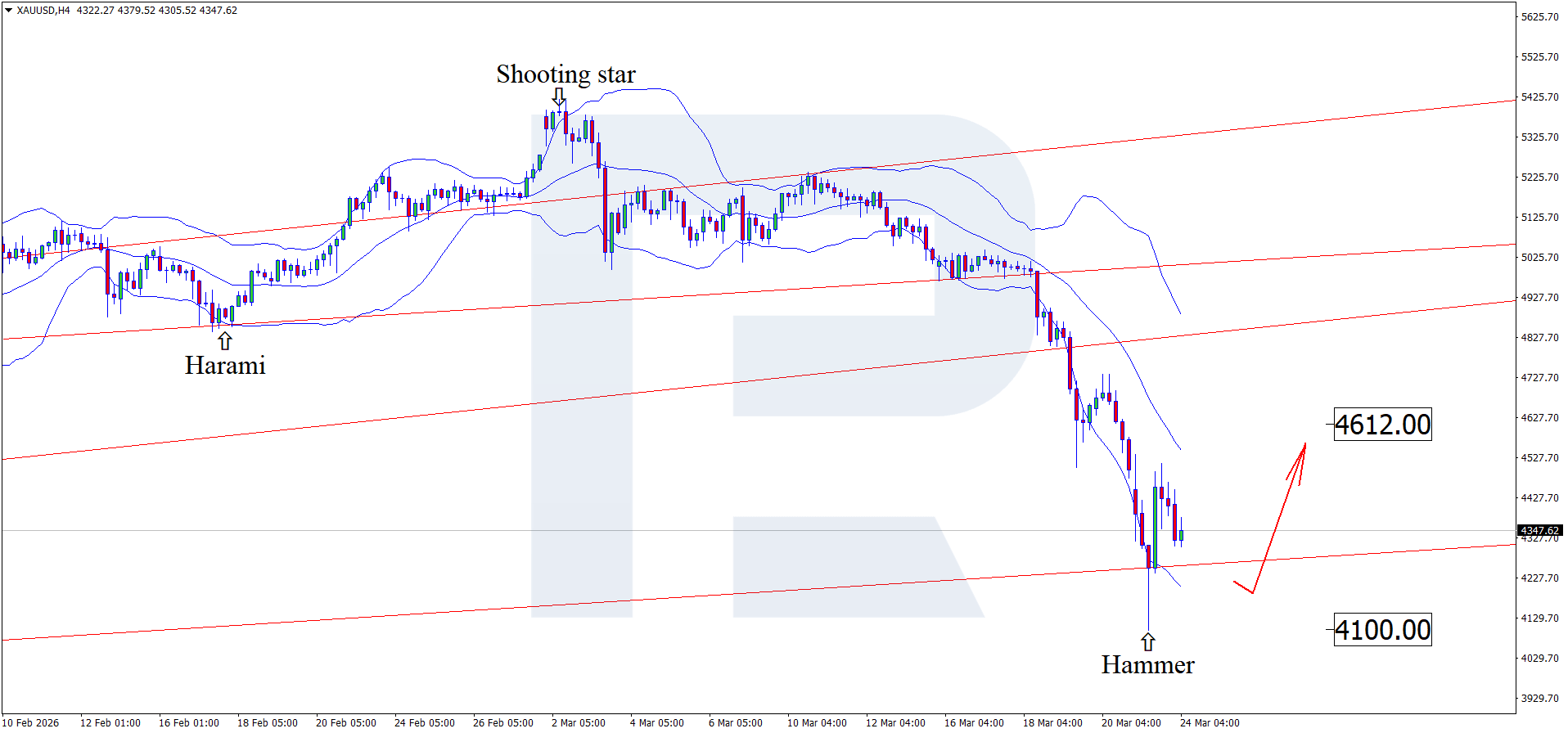 บนกราฟ H4 ราคาทองคำ XAUUSD ได้ก่อตัวเป็นรูปแบบกลับตัว Hammer ใกล้ขอบล่างของ Bollinger Bands ตามสัญญาณของรูปแบบนี้ ราคามีโอกาสสร้างคลื่นขาขึ้นในระยะสั้น เนื่องจากราคาของ XAUUSD ยังคงอยู่ในช่องแนวโน้มขาขึ้น ระดับ 4,612 USD อาจทำหน้าที่เป็นเป้าหมายขาขึ้น