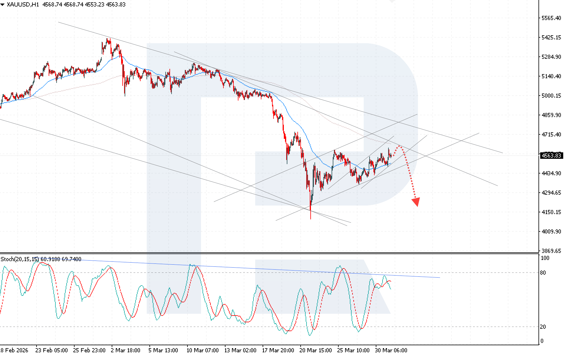 ภาพทางเทคนิคยังคงเป็นขาลง Stochastic Oscillator กำลังดีดตัวจากเส้นแนวต้านขาลงและเกิดสัญญาณ bearish crossover ซึ่งบ่งชี้ถึงความเป็นไปได้ของการเกิดโมเมนตัมขาลงเพิ่มเติม การยืนยันเพิ่มเติมจะมาจากการทะลุแนวล่างของช่องปรับฐานขาขึ้น พร้อมการยืนต่ำกว่า 4,430 USD