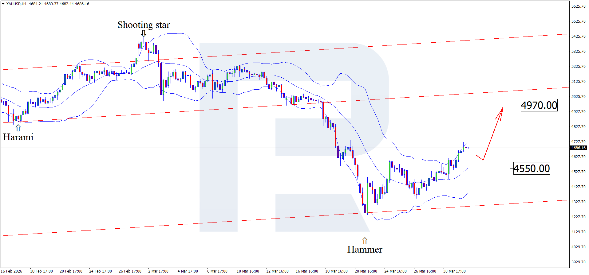 บนกราฟ H4 XAUUSD ได้ก่อตัวรูปแบบกลับตัว Hammer ใกล้ขอบล่างของ Bollinger Band ตามสัญญาณของรูปแบบนี้ ราคายังคงเดินหน้าต่อในคลื่นขาขึ้น เนื่องจากราคาของ XAUUSD ยังคงอยู่ภายในกรอบของช่องขาขึ้น ระดับ 4,970 USD อาจทำหน้าที่เป็นเป้าหมายด้านบน