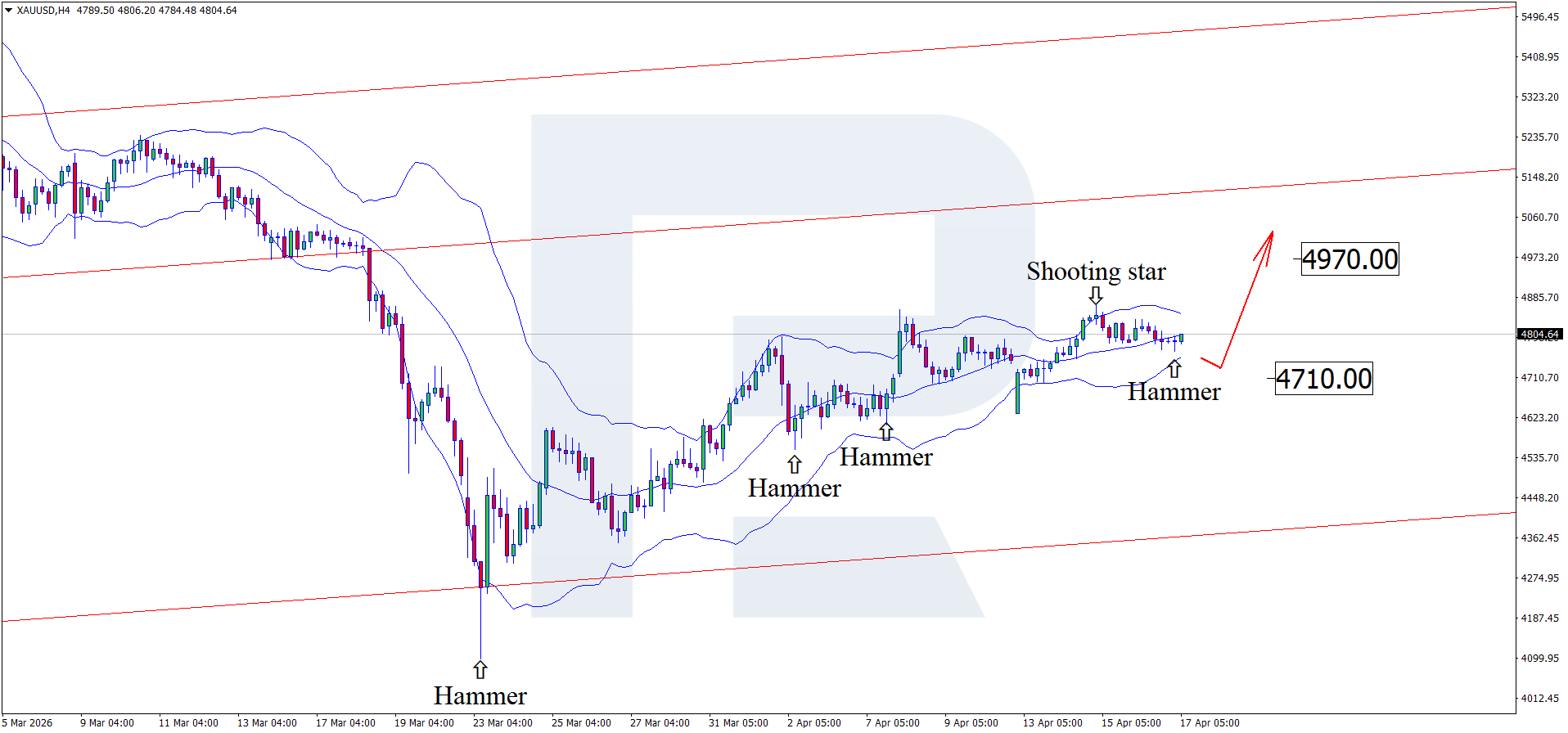 บนกราฟ H4 ราคาของ XAUUSD ได้ก่อตัวรูปแบบกลับตัว Hammer ใกล้เส้นกลางของ Bollinger Band เมื่อสัญญาณของรูปแบบเริ่มทำงาน ราคาก็อาจก่อตัวเป็นคลื่นขาขึ้น เนื่องจากราคาของ XAUUSD ยังคงอยู่ภายในช่องขาขึ้น ระดับแนวต้าน 4,970 USD อาจทำหน้าที่เป็นเป้าหมายด้านบน