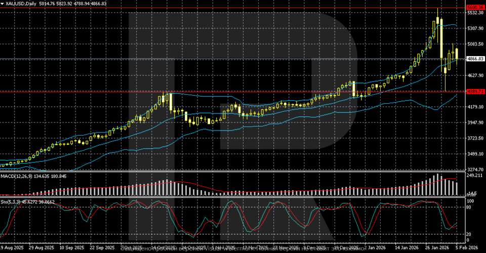 ในเชิงเทคนิค ตลาดได้เปลี่ยนจากแนวโน้มขาขึ้นที่ต่อเนื่อง ไปสู่ช่วงการกระจายตัว หลังจากขึ้นไปทำจุดสูงสุดใกล้ 5,600 ดอลลาร์ ราคาทองคำเกิดการกลับทิศอย่างรวดเร็ว โดยปัจจุบันกำลังแกว่งตัวสะสมในช่วง 4,860–4,900 ซึ่งทำหน้าที่เป็นแนวต้านระยะสั้น ความผันผวนยังอยู่ในระดับสูง MACD ยังคงอยู่ในแดนบวก แต่โมเมนตัมอ่อนลง ขณะที่ Stochastic Oscillator สนับสนุนการรีบาวด์ระยะสั้นโดยยังไม่ยืนยันการกลับเข้าสู่แนวโน้มขาขึ้น