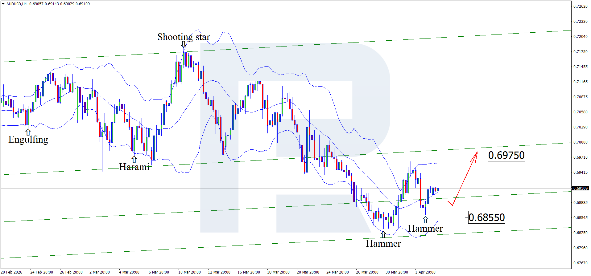การยืนต่ำกว่า 0.6855 จะบ่งชี้การกลับมาของฝั่งผู้ขายและการยกเลิกมุมมองเชิงบวก ในกรณีนี้ ราคามีแนวโน้มจะปรับตัวลงสู่ 0.6750