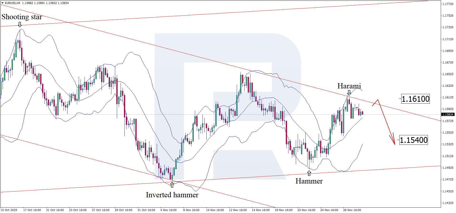 บนกราฟ H4 คู่เงิน EURUSD ก่อตัวรูปแบบกลับตัว Harami ใกล้แถบล่างของ Bollinger Bands ในระยะนี้ราคามีแนวโน้มเคลื่อนไหวลงต่อเนื่องตามสัญญาณดังกล่าว เนื่องจากราคาอยู่ในช่องแนวโน้มขาลง จึงมีโอกาสเคลื่อนลงสู่ระดับ 1.1540 การทะลุต่ำกว่าระดับนี้จะเปิดทางให้การปรับลงต่อเนื่องพัฒนาอย่างเต็มรูปแบบ