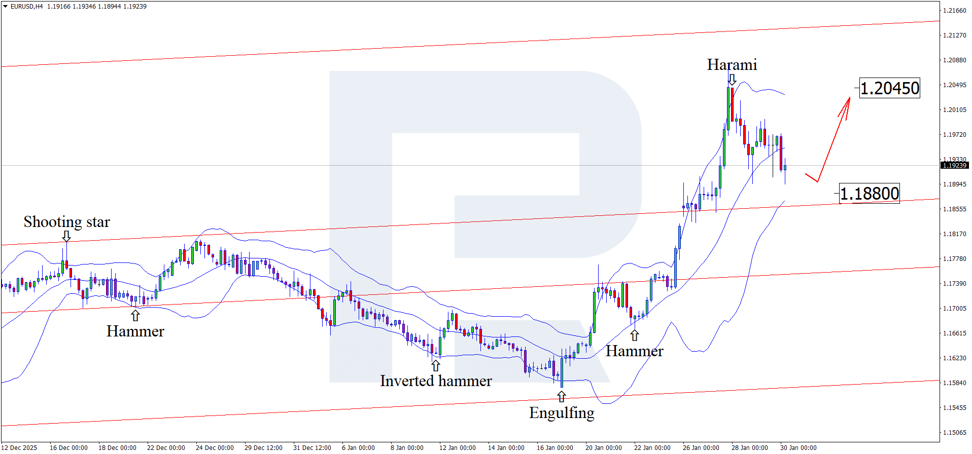 บนกราฟ H4 คู่เงิน EURUSD ได้ก่อตัวเป็นรูปแบบกลับตัว Harami ใกล้เส้น Bollinger Band ด้านบน ในระยะนี้ ราคาเดินหน้าพัฒนาเป็นคลื่นปรับฐานตามสัญญาณของรูปแบบดังกล่าว และเนื่องจากราคายังคงเคลื่อนไหวภายในช่องขาขึ้น จึงอาจปรับตัวลงสู่ระดับ 1.1880 การดีดตัวจากระดับนี้จะเปิดทางให้โมเมนตัมขาขึ้นดำเนินต่อไป