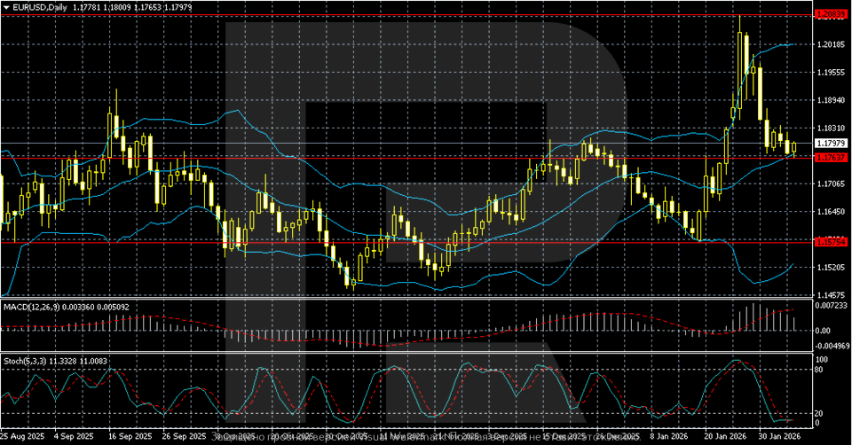 ในเชิงเทคนิค คู่เงิน EURUSD ยังคงอยู่ในช่วงปรับฐานภายในแนวโน้มขาขึ้น หลังจากการปรับขึ้นแรงในเดือนมกราคมไปยังบริเวณ 1.2000–1.2050 ปัจจุบันราคากำลังแกว่งตัวสะสมในโซน 1.1760–1.1800 ซึ่งเป็นแนวรับสำคัญ ราคาเคลื่อนไหวใกล้เส้นกลางของ Bollinger Bands และความผันผวนลดลง MACD ยังคงอยู่ในแดนบวก ขณะที่ Stochastic Oscillator ยืนยันถึงการหยุดพักของแนวโน้มโดยยังไม่ให้สัญญาณกลับทิศ
