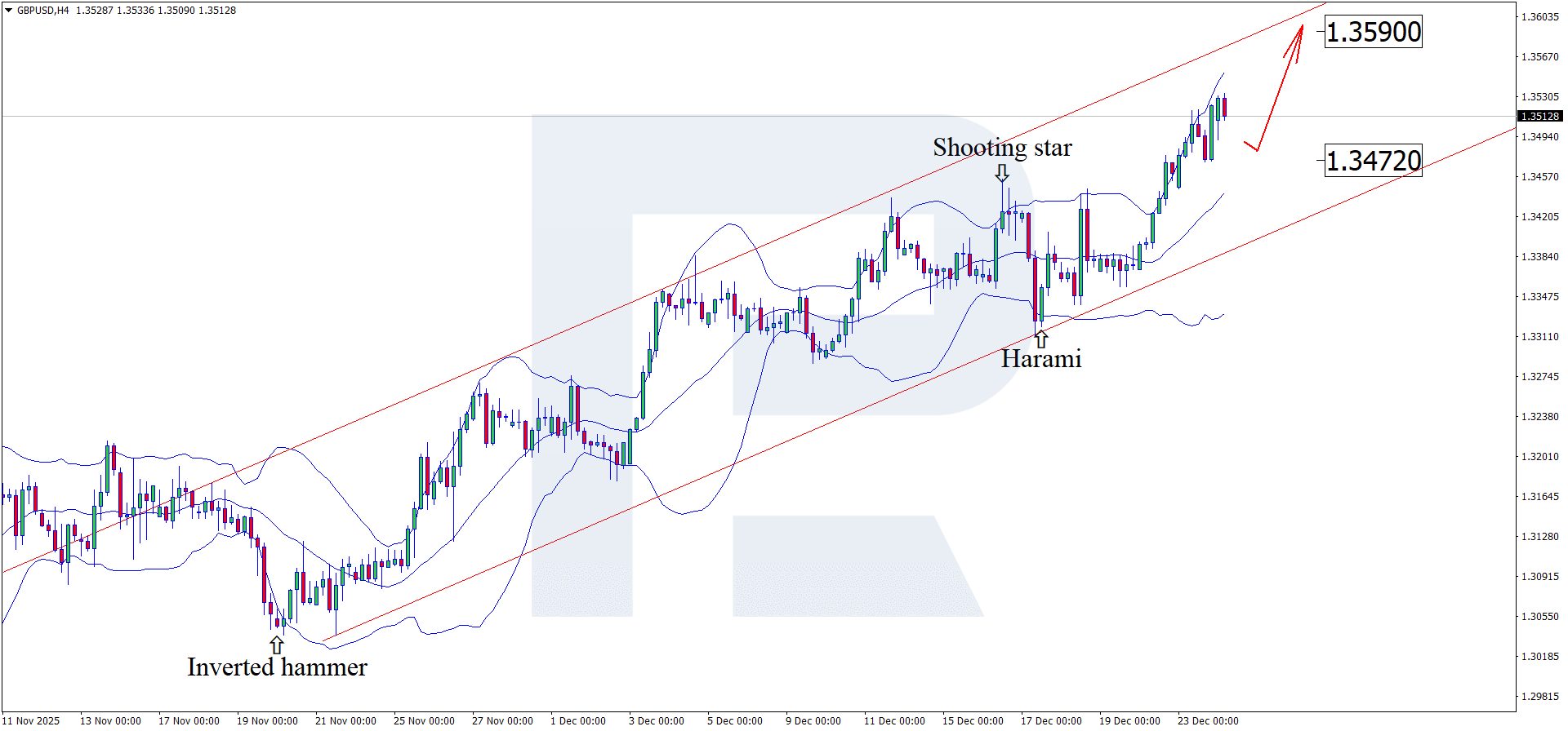 การคาดการณ์สำหรับวันที่ 24 ธันวาคม 2025 ยังพิจารณาสถานการณ์ทางเลือก ซึ่งอาจเกิดการปรับฐานลงสู่ระดับ 1.3472 ก่อนที่การปรับตัวขึ้นจะกลับมาอีกครั้ง