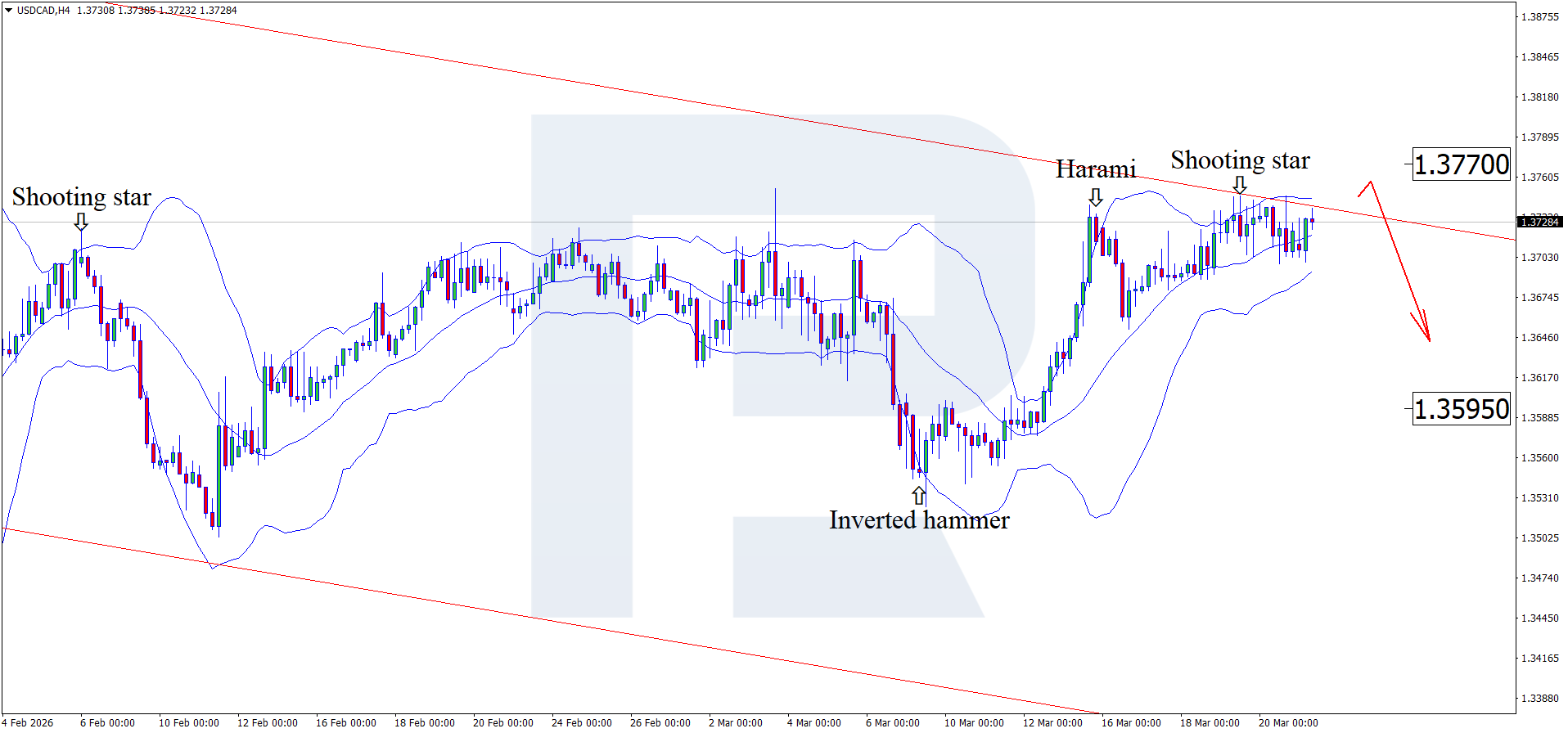 บนกราฟ H4 คู่ USDCAD ได้ก่อตัวรูปแบบกลับตัว Shooting Star ใกล้เส้น Bollinger Band ด้านบน และอาจพัฒนาเป็นคลื่นขาลงตามสัญญาณดังกล่าว เนื่องจากราคากำลังทดสอบขอบบนของช่องขาลง จึงมีโอกาสปรับตัวลงสู่แนวรับใกล้ที่สุดที่ 1.3595 หากทะลุลงต่ำกว่าระดับนี้ จะเปิดทางให้แนวโน้มขาลงดำเนินต่อ