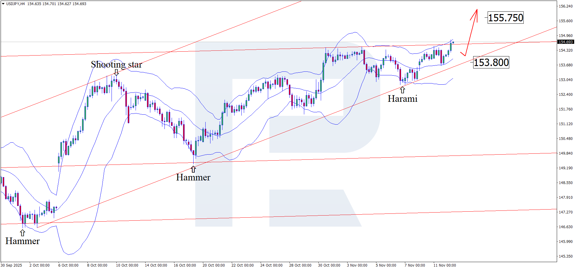 ในกราฟ H4 คู่เงิน USDJPY ได้ก่อตัวรูปแบบแท่งเทียนกลับตัว “Harami” ใกล้เส้นล่างของ Bollinger Band และปัจจุบันซื้อขายอยู่บริเวณ 154.60 ราคายังคงเคลื่อนไหวในทิศทางขาขึ้นตามสัญญาณจากรูปแบบดังกล่าว โดยมีเป้าหมายขาขึ้นถัดไปที่ระดับ 155.75