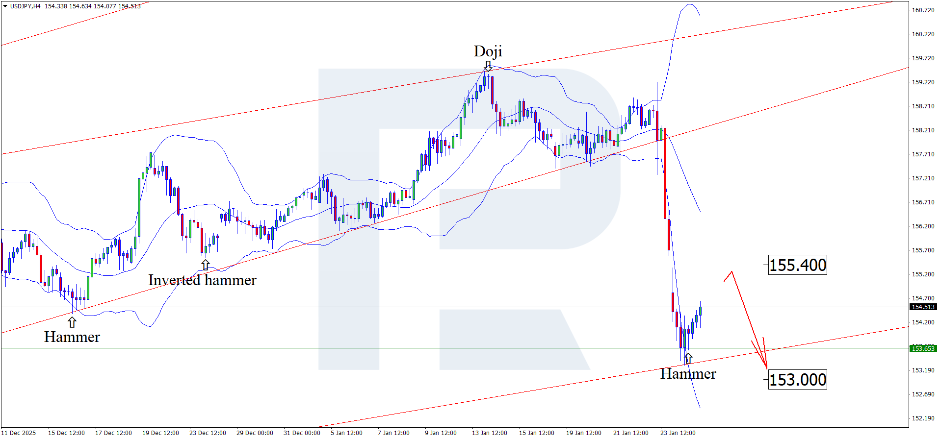 หลังจากการปรับตัวลงอย่างรุนแรง อัตรา USDJPY กำลังก่อตัวเป็นการปรับฐาน ท่ามกลางข่าวลือเกี่ยวกับความเป็นไปได้ของการแทรกแซง ตลาดคาดว่าความผันผวนจะยังคงอยู่ในระดับสูง โดยราคาปัจจุบันอยู่ที่ 154.45 ดูรายละเอียดเพิ่มเติมได้ในการวิเคราะห์ของเราสำหรับ 27 มกราคม 2026