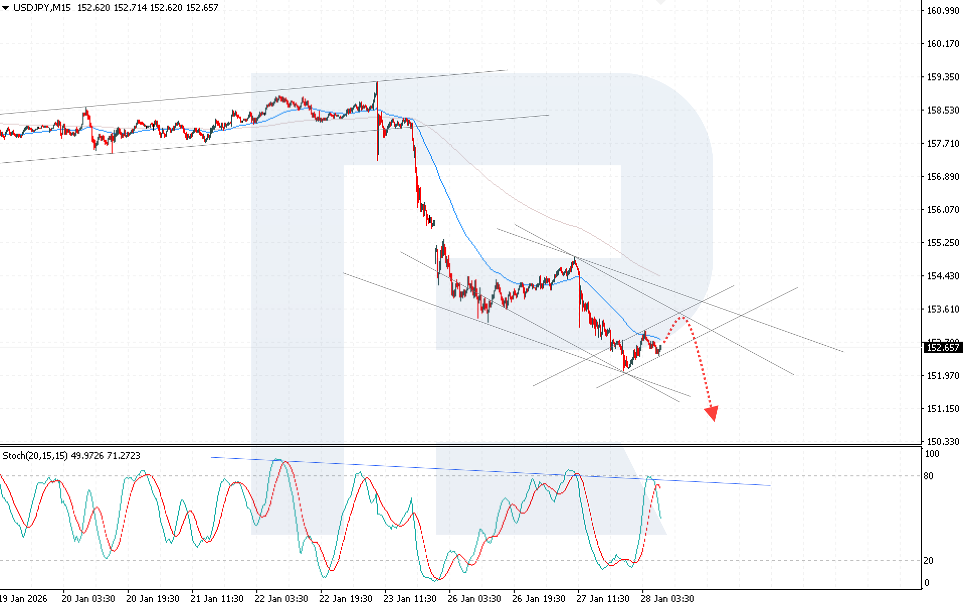คู่เงิน USDJPY กำลังอยู่ในช่วงการปรับฐานหลังจากการปรับตัวลงอย่างรุนแรง ท่ามกลางการแข็งค่าของเงินเยนญี่ปุ่นซึ่งได้รับแรงหนุนจากปัจจัยพื้นฐาน โดยปัจจุบันอัตราแลกเปลี่ยนอยู่ที่ระดับ 152.65 ดูรายละเอียดเพิ่มเติมได้ในการวิเคราะห์ของเราสำหรับ 28 มกราคม 2026.