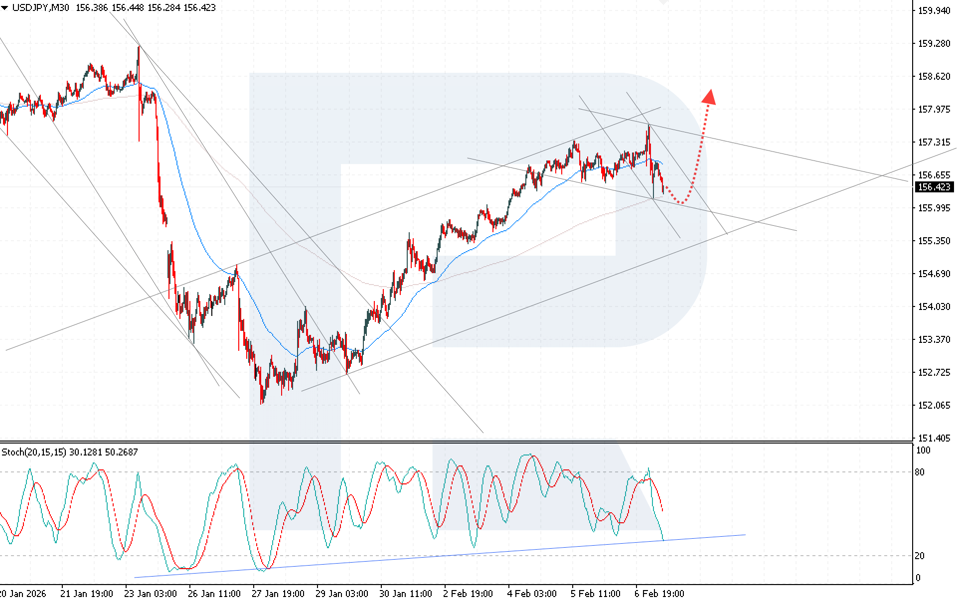 แรงกดดันจากการปรับฐานที่เพิ่มขึ้น หากราคายืนต่ำกว่าระดับ 156.45 อาจกระตุ้นให้เกิดการปรับตัวลงที่ลึกขึ้น และทำลายโครงสร้างขาขึ้นทางเทคนิค ความเสี่ยงเพิ่มเติมต่อโมเมนตัมขาขึ้นคือแรงสนับสนุนเชิงพื้นฐานต่อเงินเยน จากเสถียรภาพทางการเมืองและความคาดหวังต่อนโยบายการคลังแบบผ่อนคลายในญี่ปุ่น