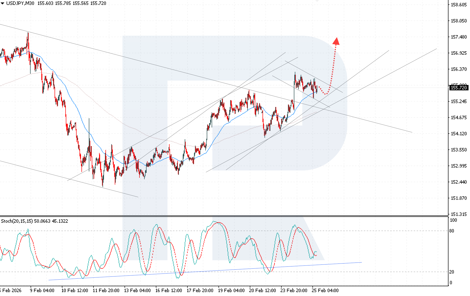 การคาดการณ์ USDJPY วันนี้ชี้ถึงการปรับขึ้นอีกครั้งสู่ 157.45 โครงสร้างทางเทคนิคยังคงเอื้อต่อฝั่งซื้อ โดย Stochastic Oscillator สนับสนุนสถานการณ์นี้ อินดิเคเตอร์ได้ออกจากเขต overbought และเกิด bullish crossover เสริมสัญญาณการเติบโตต่อ การทะลุเหนือขอบบนของช่องปรับฐานและการยืนเหนือ 155.95 จะยืนยันสถานการณ์หลัก และให้สัญญาณทางเทคนิคเพิ่มเติมสำหรับการปรับตัวขึ้นต่อ