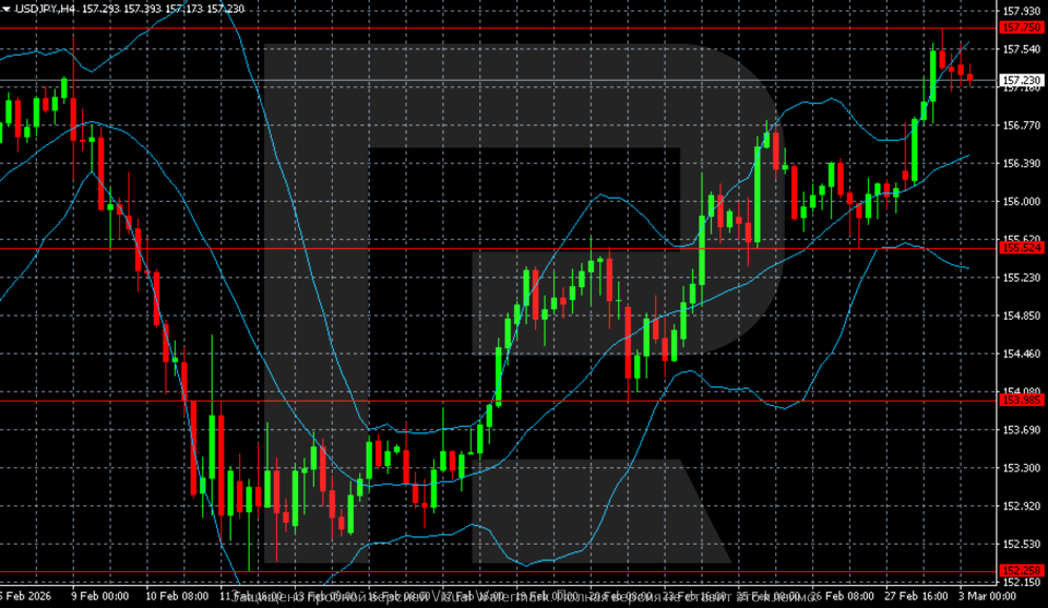 คู่เงิน USDJPY แข็งค่าขึ้นอย่างมีนัยสำคัญ และกำลังพักตัวเพื่อการปรับฐาน คาดการณ์สำหรับวันที่ 3 มีนาคม 2026 ชี้ถึงการปรับตัวขึ้นต่อสู่ระดับ 157.75