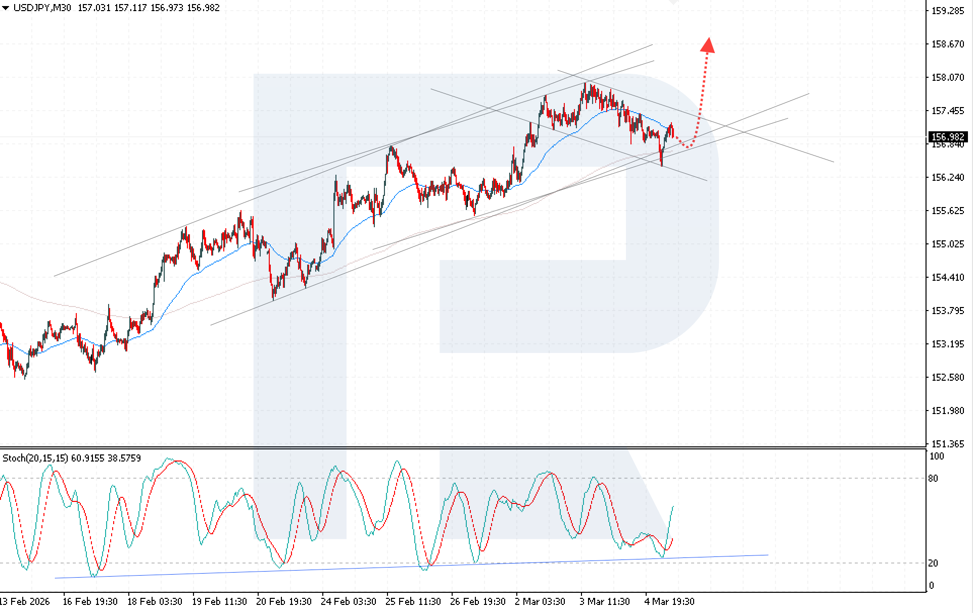 ภาพทางเทคนิคยังคงสนับสนุนฝั่งกระทิง Stochastic Oscillator ส่งสัญญาณแรงซื้อที่เพิ่มขึ้น แม้ว่าจะมีการปรับฐานในปัจจุบัน ค่าออสซิลเลเตอร์ดีดตัวจากเส้นแนวรับและเกิด bullish crossover ซึ่งบ่งชี้ถึงโอกาสที่แนวโน้มขาขึ้นจะกลับมาดำเนินต่อ การทะลุขึ้นเหนือขอบบนของช่องปรับฐานอย่างชัดเจน พร้อมการยืนเหนือระดับ 157.50 จะยืนยันสถานการณ์หลักและเพิ่มความเป็นไปได้ของการปรับตัวขึ้นอย่างต่อเนื่อง