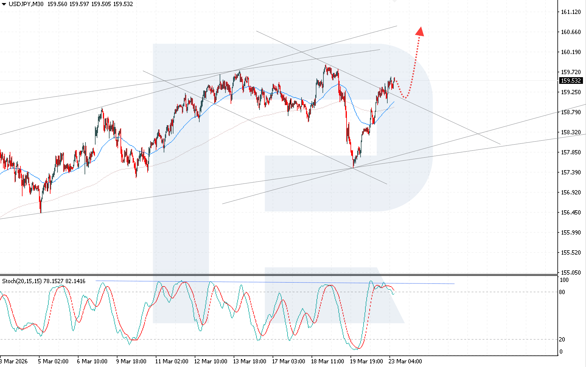 การปรับฐานระยะสั้นจากภาวะ overbought ของ Stochastic Oscillator อาจเป็นความเสี่ยงต่อแนวโน้มขาขึ้นของ USDJPY ในวันนี้ โดยอาจกดราคาลงและลดความร้อนแรงของตัวชี้วัด ปัจจัยลบเพิ่มเติมคือการปรับตัวลงต่ำกว่า 158.75 ซึ่งจะลดแรงซื้อและย้ำความสำคัญของแนวต้าน 159.75