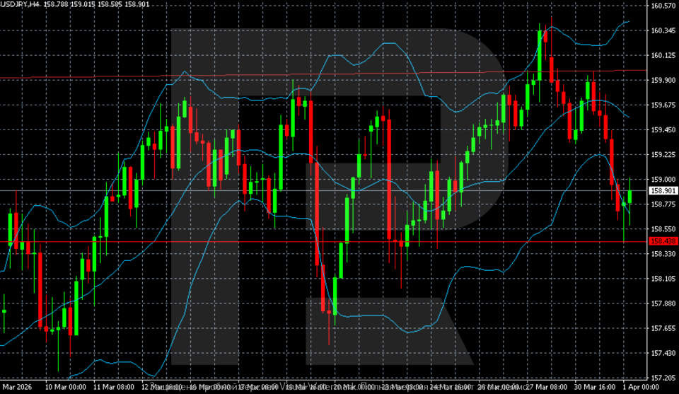 คู่ USDJPY ปรับตัวลงและเข้าสู่ช่วงพักตัว โดยความตึงเครียดภายนอกที่ลดลงเป็นปัจจัยหลัก การคาดการณ์ USDJPY สำหรับวันนี้ 1 เมษายน 2026 ชี้ไปที่การเคลื่อนไหวแบบไซด์เวย์ในกรอบ 158.50–160.00