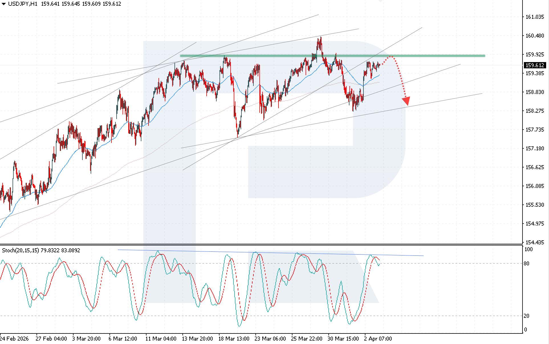 ภาพทางเทคนิคกำลังเอนเอียงไปทางฝั่งผู้ขาย Stochastic Oscillator กำลังดีดตัวจากเส้นแนวต้านขาลง ยังคงอยู่ในเขตซื้อมากเกินไป และกำลังก่อตัวเป็น bearish crossover ซึ่งเพิ่มความเป็นไปได้ของการเคลื่อนไหวลง การหลุดต่ำกว่าขอบล่างของช่องขาขึ้นและการยืนต่ำกว่า 158.70 จะยืนยันการปรับตัวลง และเปิดทางสู่เป้าหมายที่ระบุไว้