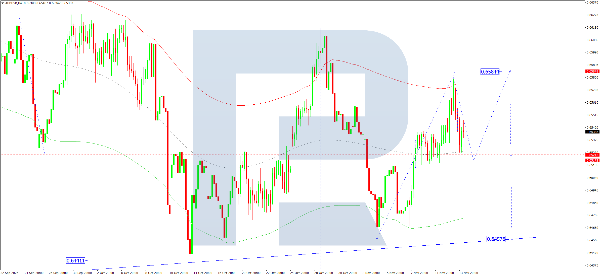 บนกราฟ H4 ของ AUDUSD ตลาดได้ทำคลื่นปรับฐานขึ้นไปถึงระดับ 0.6579 ในวันที่ 14 พฤศจิกายน 2025 คาดว่าคลื่นขาลงจะเริ่มต้นไปที่ 0.6515 ก่อนจะดีดตัวขึ้นเล็กน้อยไปที่ 0.6545 ตลาดจะสร้างกรอบสะสมใหม่รอบระดับ 0.6555 การทะลุกรอบขึ้นอาจขยายคลื่นปรับฐานต่อไปถึง 0.6585 ในขณะที่การทะลุกรอบลงจะเปิดโอกาสให้แนวโน้มขาลงต่อเนื่องไปถึง 0.6454
