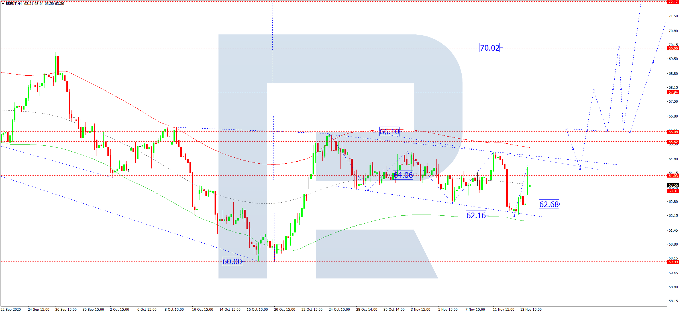 บนกราฟ H4 ของน้ำมันดิบ Brent ตลาดได้ทำคลื่นแรงกระตุ้นขาขึ้นไปถึงระดับ 64.44 ในวันที่ 14 พฤศจิกายน 2025 คาดว่าจะเกิดคลื่นปรับฐานลงไปที่ 63.33 หลังจากนั้นตลาดจะสร้างกรอบสะสมใหม่ การทะลุกรอบขึ้นไปจะเปิดโอกาสให้ราคาปรับตัวขึ้นต่อไปถึง 66.10 และหากทะลุเหนือระดับ 66.10 ได้ แนวโน้มจะขยายขึ้นไปถึงเป้าหมายระยะใกล้ที่ 70.00