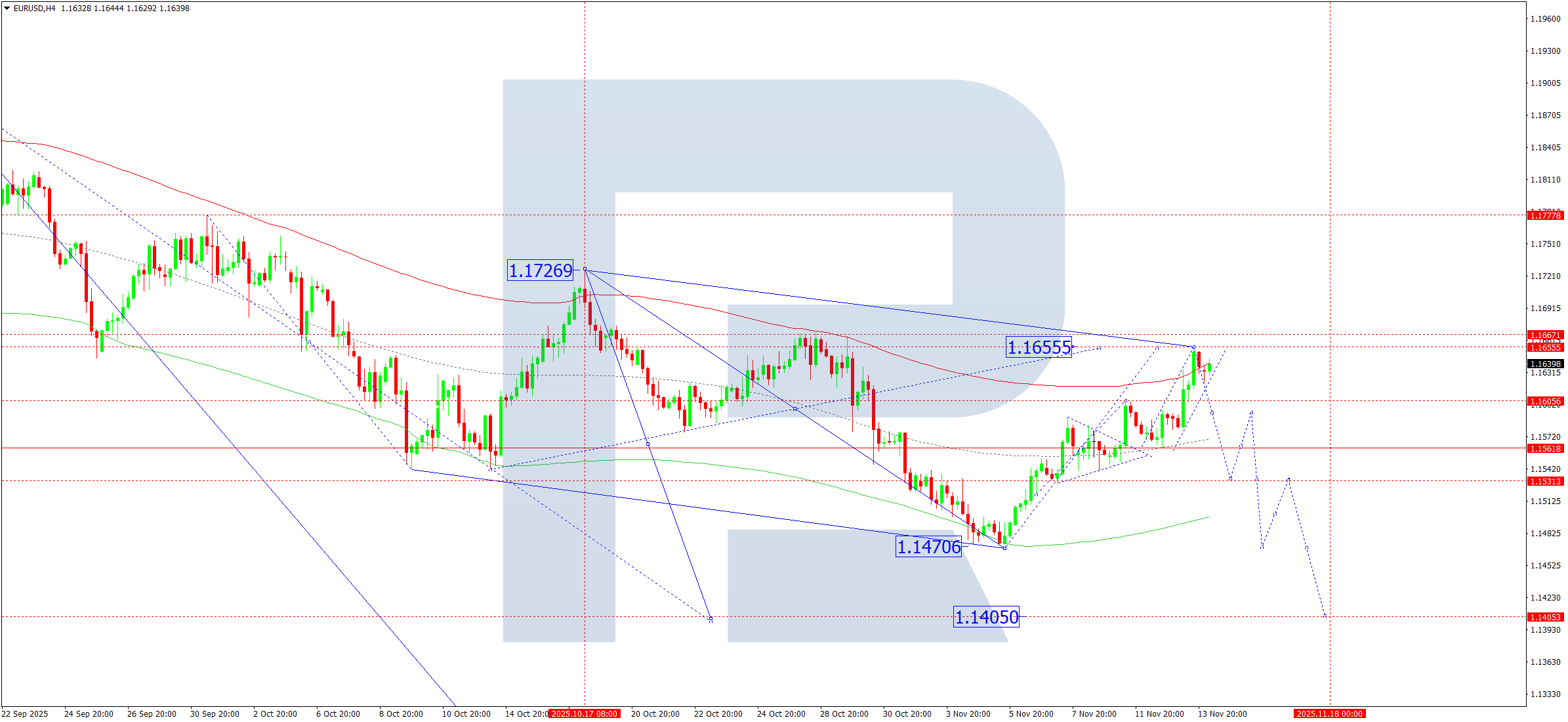 บนกราฟ H4 ของ EURUSD ตลาดได้สร้างกรอบการสะสมแคบ ๆ รอบระดับ 1.1562 และได้ทะลุขึ้นด้านบน ในวันที่ 14 พฤศจิกายน 2025 หลังจากได้รับแรงหนุนที่ 1.1605 ตลาดได้ทำโครงสร้างการปรับฐานเพิ่มเติมจนถึงระดับ 1.1655 จากนั้นเกิดแรงกระตุ้นขาลงไปถึง 1.1622 ตามด้วยการปรับฐานกลับขึ้นไปที่ 1.1644 การทะลุกรอบลงจะเปิดโอกาสให้ราคาปรับตัวลดลงต่อเนื่องไปถึง 1.1533 และอาจขยายแนวโน้มลงไปถึง 1.1405 หากราคาทะลุขึ้นเหนือกรอบ ระดับถัดไปที่คู่เงินอาจแตะได้คือ 1.1666 ซึ่งเป็นจุดสูงสุดของคลื่นปรับฐานปัจจุบัน หลังจากนั้นมีแนวโน้มสูงที่คลื่นขาลงใหม่จะเริ่มต้นมุ่งหน้าไปที่ 1.1405