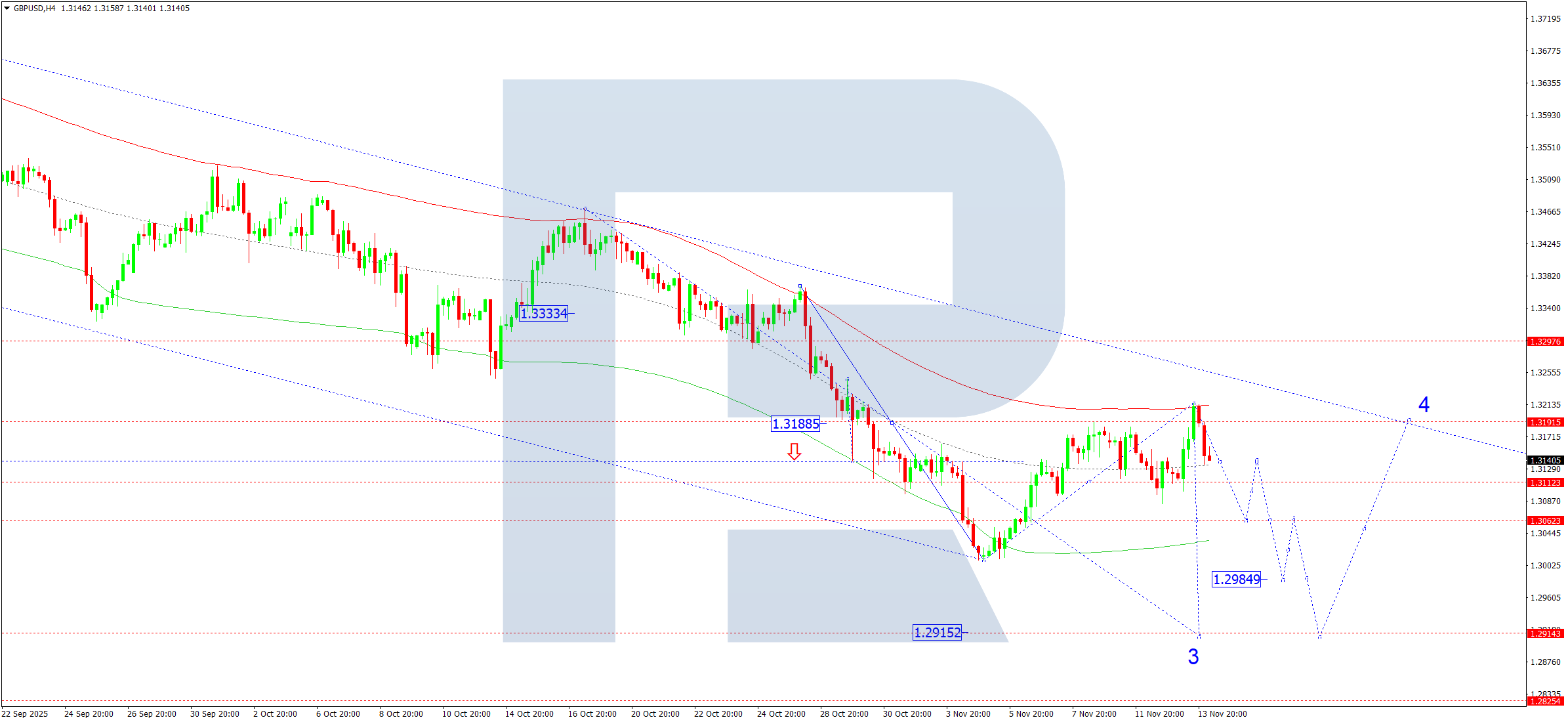 บนกราฟ H4 ของ GBPUSD ตลาดได้ทำคลื่นปรับฐานขึ้นไปถึงระดับ 1.3215 ในวันที่ 14 พฤศจิกายน 2025 ปัจจุบันตลาดกำลังสร้างแรงกระตุ้นขาลงไปที่ 1.3131 การทะลุต่ำกว่าระดับนี้จะเปิดโอกาสให้ราคาปรับตัวลงต่อไปยัง 1.3065 และอาจขยายแนวโน้มลงต่อเนื่องไปถึง 1.2915 ซึ่งเป็นเป้าหมายระยะใกล้ในคลื่นที่สามของแนวโน้มขาลง