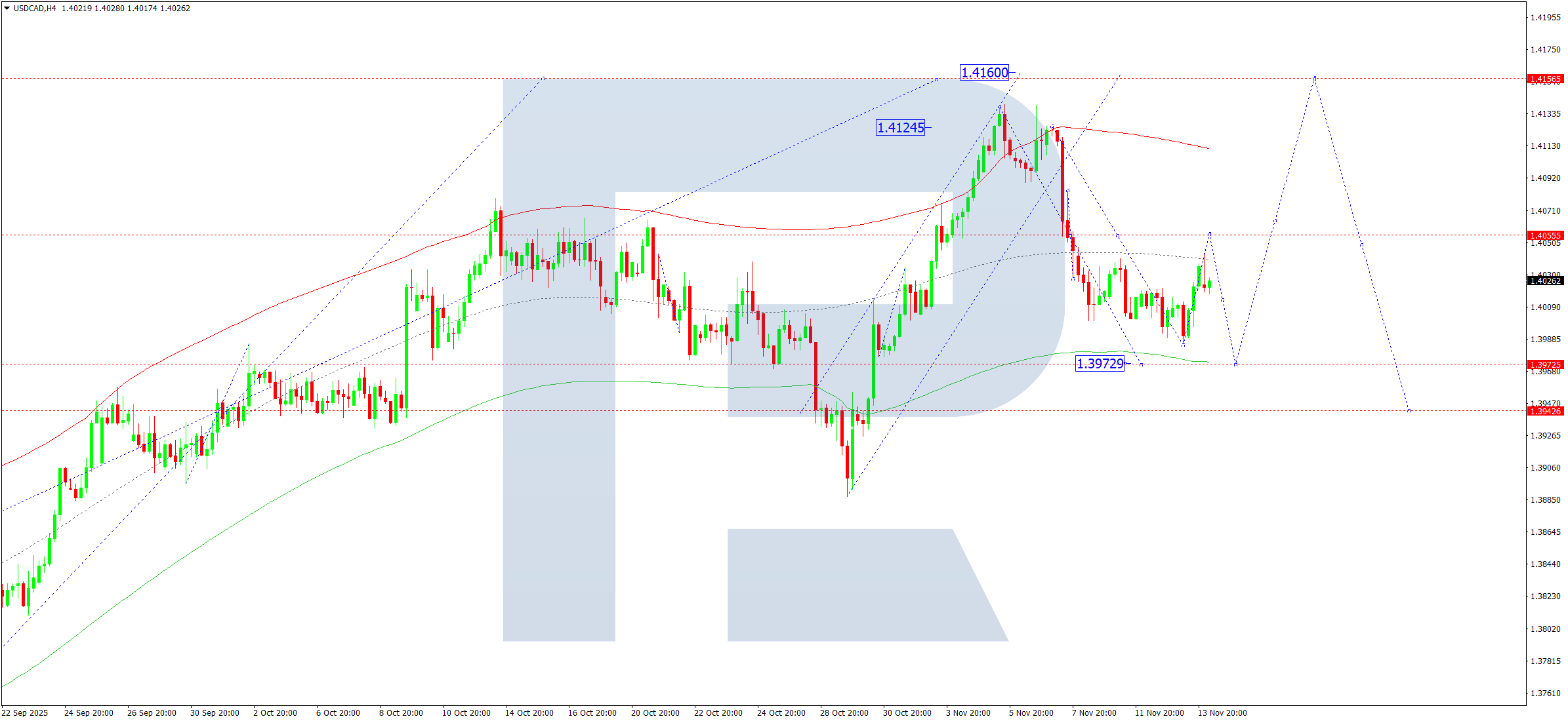 บนกราฟ H4 ของ USDCAD ตลาดได้ทำคลื่นปรับฐานลงมาถึงระดับ 1.3985 ในวันที่ 14 พฤศจิกายน 2025 ขณะนี้ตลาดกำลังพัฒนาคลื่นขาขึ้นใหม่มุ่งหน้าไปที่ 1.4055 หลังจากนั้นอาจเกิดการปรับฐานอีกรอบลงไปที่ 1.3973 ระดับนี้จะเป็นจุดที่ทำให้ศักยภาพการปรับฐานสิ้นสุดลงอย่างสมบูรณ์ ก่อนที่คลื่นขาขึ้นใหม่จะเริ่มต้น โดยมีเป้าหมายที่ระดับ 1.4160 ซึ่งเป็นเป้าหมายระยะใกล้
