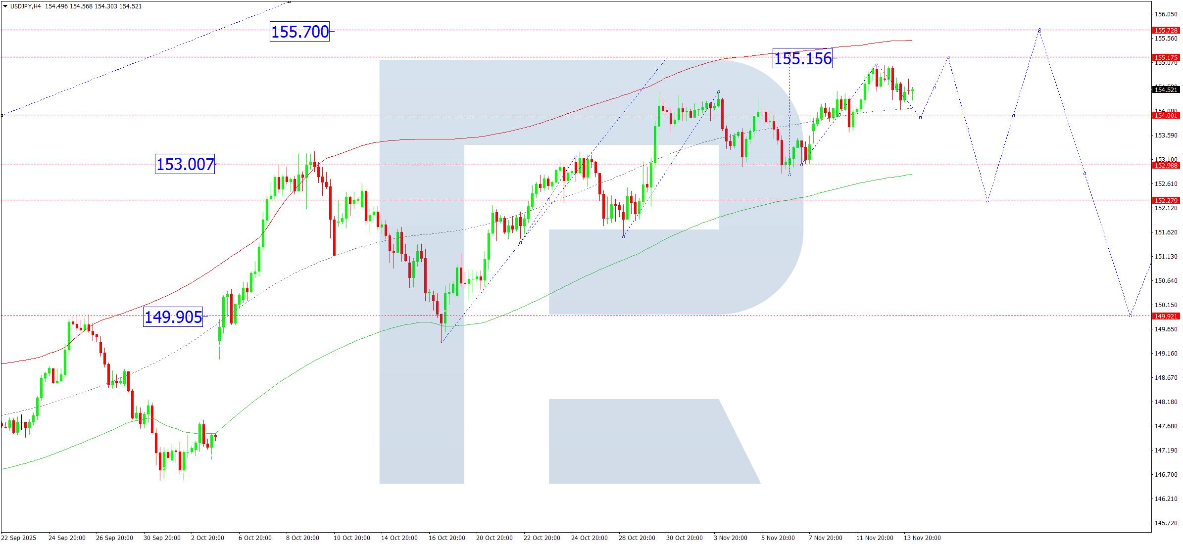 บนกราฟ H4 ของ USDJPY ตลาดยังคงสร้างคลื่นปรับฐานขึ้นไปที่ระดับ 154.00 ในวันที่ 14 พฤศจิกายน 2025 คลื่นปรับฐานนี้อาจสิ้นสุด และตามมาด้วยการเริ่มต้นของคลื่นขาขึ้นใหม่มุ่งหน้าไปยัง 155.15 ตลาดจะสร้างกรอบการสะสมใหม่รอบระดับ 154.00 การทะลุกรอบขึ้นไปจะเปิดโอกาสให้คลื่นขาขึ้นต่อเนื่องไปถึง 155.70 และอาจขยายต่อไปถึง 157.57 ซึ่งเป็นเป้าหมายระยะใกล้ ในทางกลับกัน การทะลุกรอบลงอาจกระตุ้นให้เกิดคลื่นปรับฐานลงไปอย่างน้อยถึง 152.22 ก่อนจะดีดกลับขึ้นไปถึง 155.70 อีกครั้ง