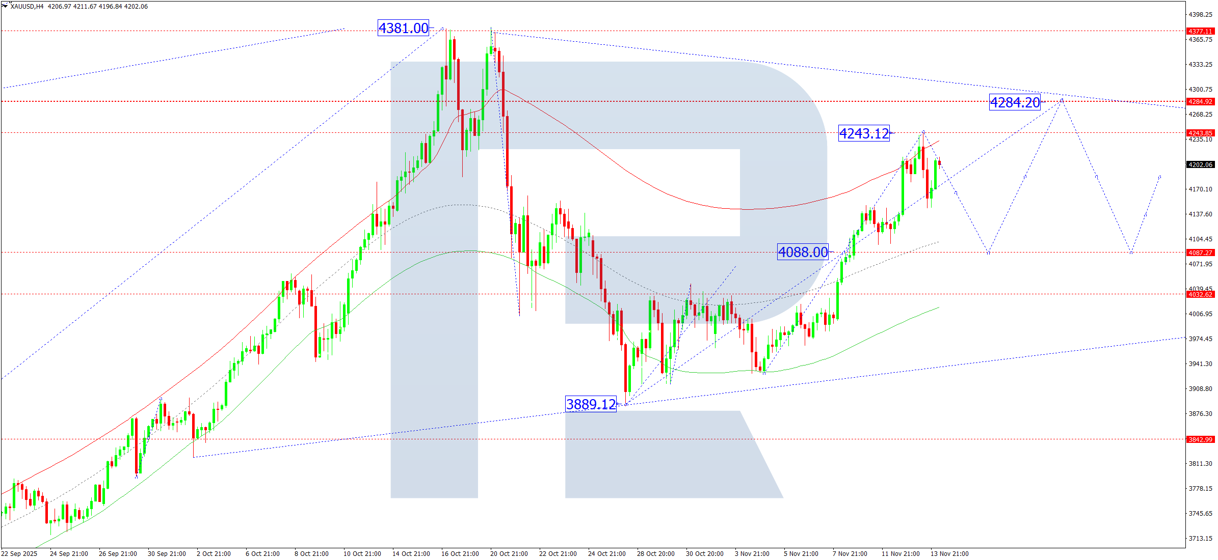 บนกราฟ H4 ของ XAUUSD ตลาดได้ทำคลื่นขาขึ้นไปถึงระดับ 4,243 ซึ่งเป็นเป้าหมายระยะใกล้ ในวันที่ 14 พฤศจิกายน 2025 คาดว่าตลาดจะสร้างกรอบสะสมราคารอบใต้ระดับดังกล่าว การทะลุกรอบลงจะเปิดโอกาสให้ราคาปรับตัวลงไปที่ 4,088 ส่วนการทะลุกรอบขึ้นจะเปิดทางให้คลื่นขาขึ้นต่อเนื่องไปถึง 4,284