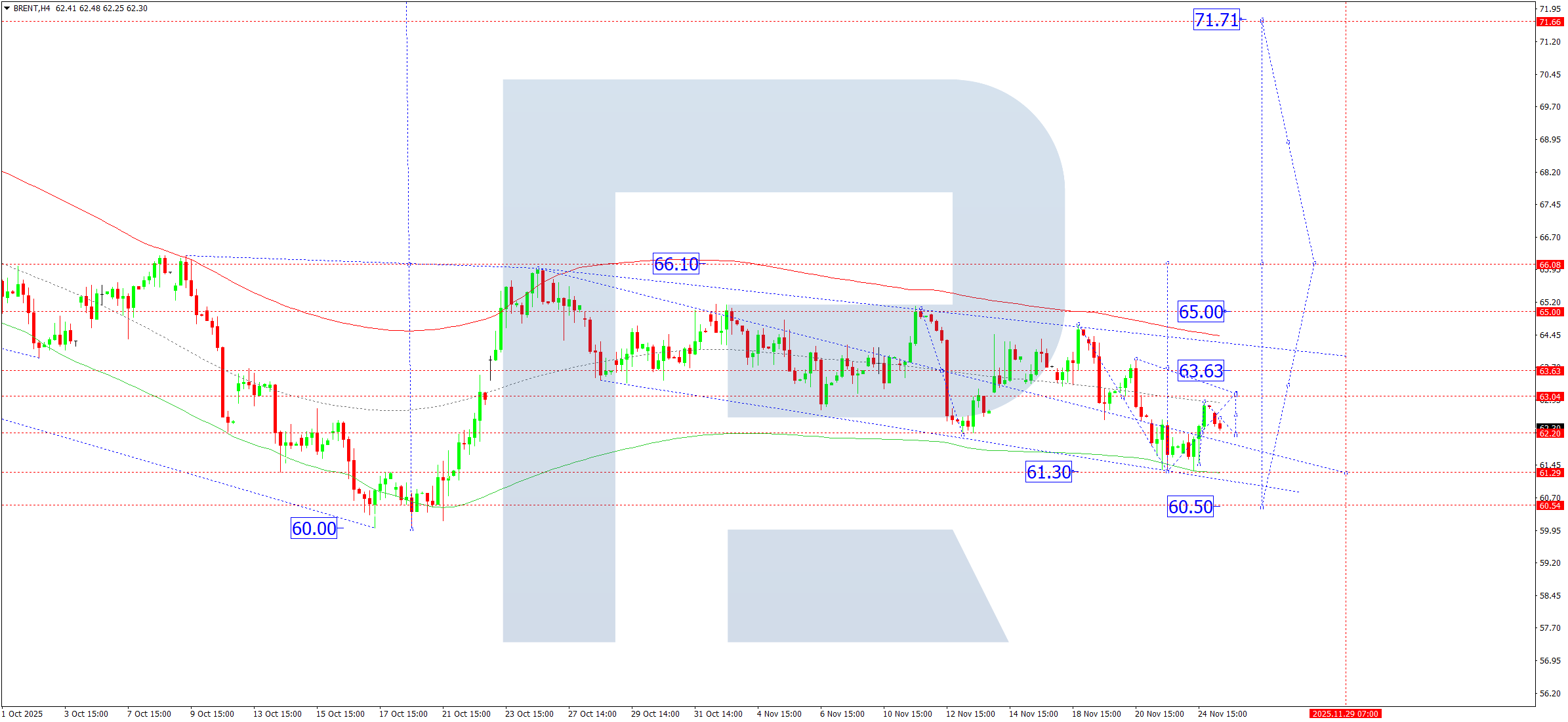 บนกราฟ H4 ของ Brent ตลาดกำลังก่อตัวกรอบการสะสมรอบระดับ 62.62 ในวันที่ 25 พฤศจิกายน 2025 การทะลุกรอบขึ้นด้านบนจะเปิดโอกาสให้การเคลื่อนไหวขาขึ้นต่อเนื่องไปที่ 66.10 โดยคลื่นอาจขยายต่อไปถึง 71.71 ในทางกลับกัน หากราคาทะลุกรอบลงด้านล่าง การปรับฐานขาลงอีกระลอกหนึ่งไปที่ 60.50 ยังมีความเป็นไปได้ หลังจากการปรับฐานนี้เสร็จสิ้น การปรับตัวขึ้นไปที่ 65.00 อาจตามมา