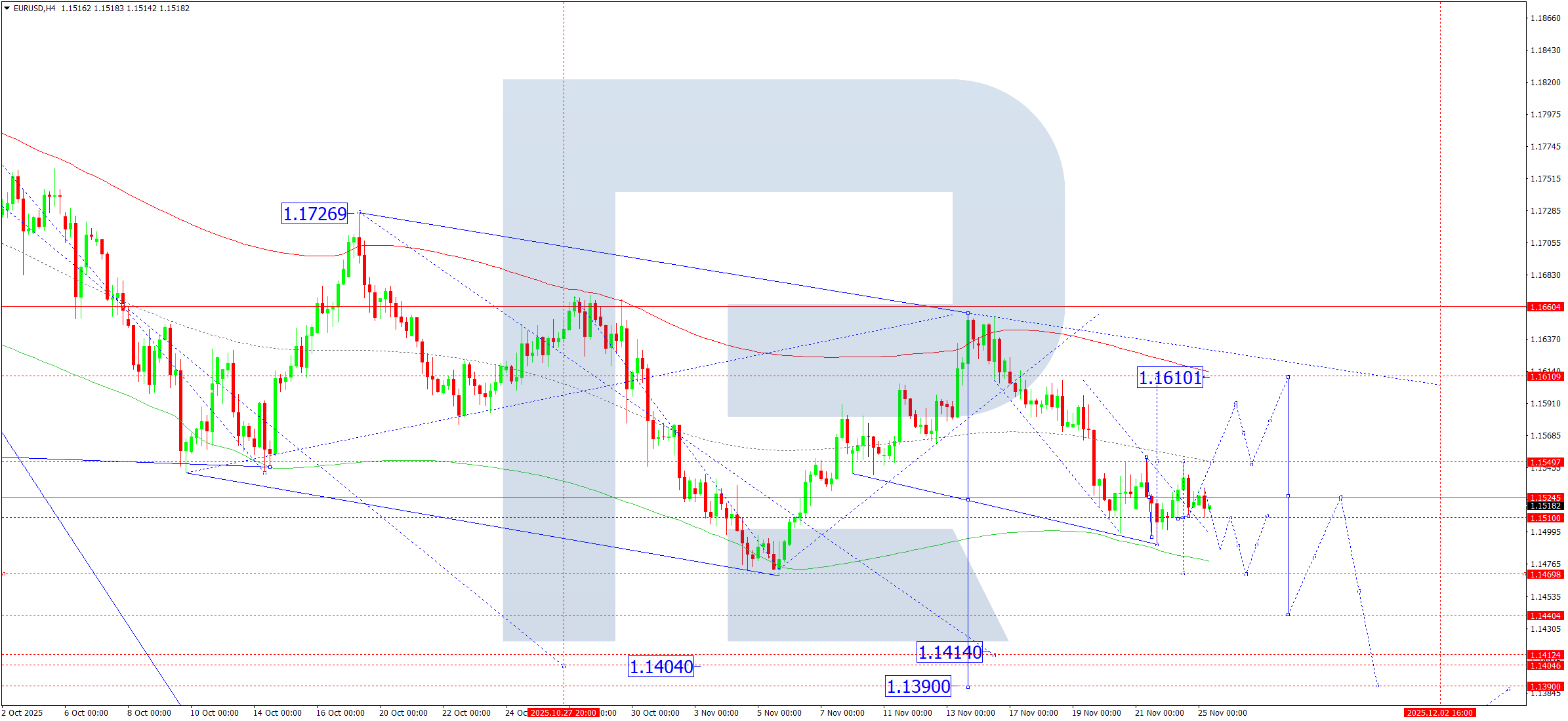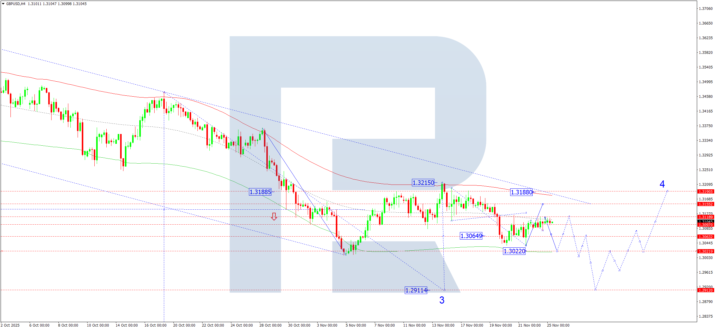 บนกราฟ H4 ของ XAUUSD ตลาดได้ทำคลื่นขาขึ้นไปถึงระดับ 4,141 เสร็จสมบูรณ์ และกำลังก่อตัวกรอบการสะสมรอบระดับดังกล่าว ในวันที่ 25 พฤศจิกายน 2025 การทะลุกรอบขึ้นด้านบนเป็นไปได้ โดยมีเป้าหมายที่ 4,244 หลังจากนั้นอาจมีการปรับฐานลงมาที่ 4,141 (ทดสอบจากด้านบน) ก่อนจะปรับตัวขึ้นต่อไปยัง 4,285