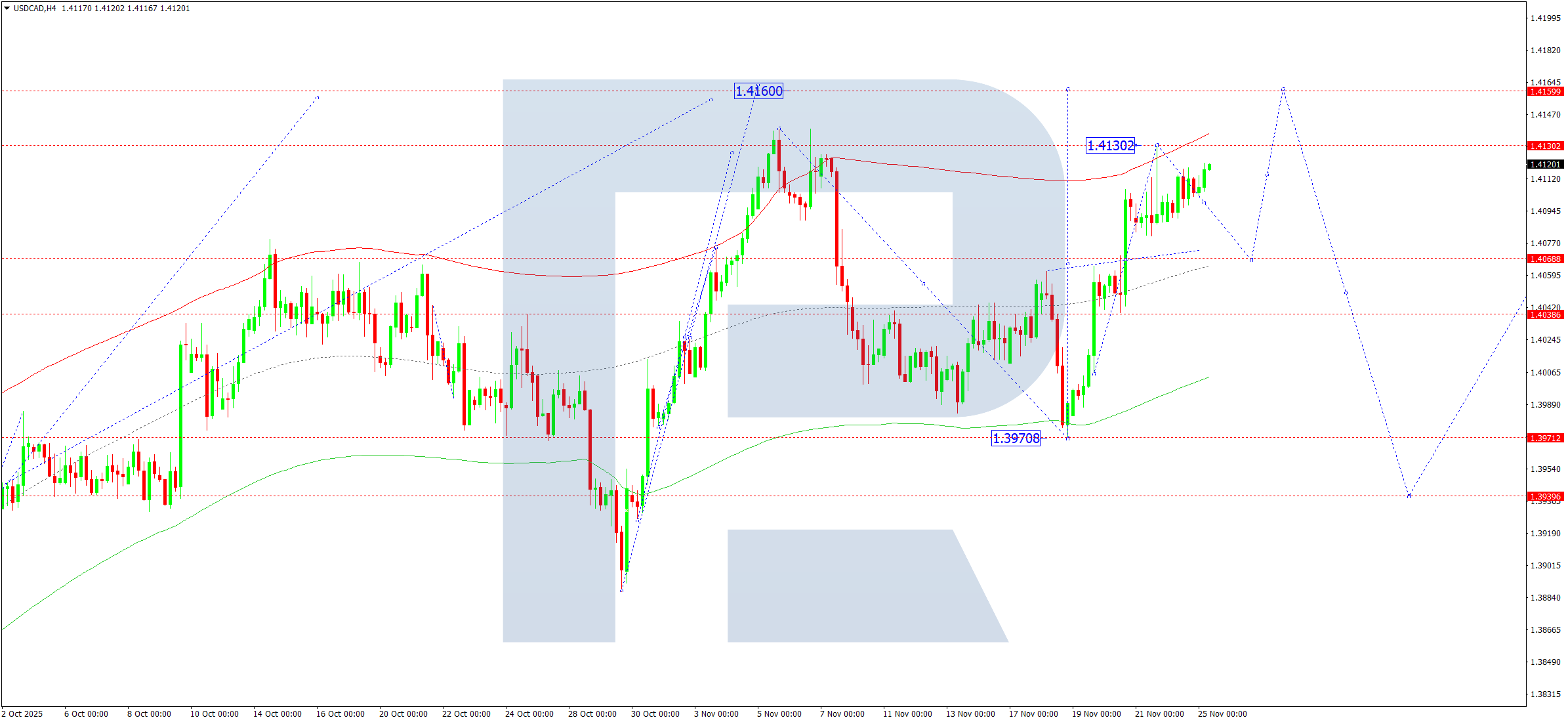 บนกราฟ H4 ของ USDCAD ตลาดยังคงพัฒนากรอบการสะสมรอบบริเวณ 1.4100 ในวันที่ 25 พฤศจิกายน 2025 หากราคาทะลุกรอบลงด้านล่าง การปรับฐานลงไปที่ 1.4070 ยังมีความเป็นไปได้ การทะลุกรอบขึ้นด้านบนจะเปิดทางให้คลื่นขาขึ้นไปที่ 1.4160 ซึ่งเป็นเป้าหมายระยะใกล้