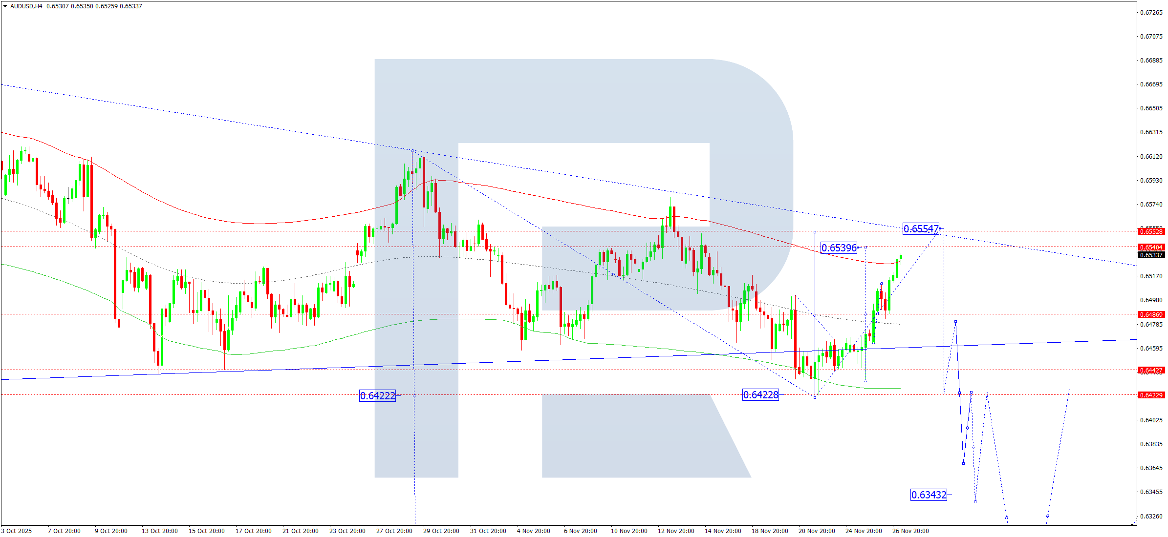 บนกราฟ H4 ของ AUDUSD ตลาดยังคงสร้างคลื่นขาขึ้นไปที่ 0.6539 ต่อไป ในวันที่ 27 พฤศจิกายน 2025 คาดว่าคู่สกุลนี้จะไปถึงระดับเป้าหมายดังกล่าว หลังจากนั้นคาดว่าจะมีการปรับตัวลงไปที่ 0.6464 (ทดสอบจากด้านบน) และต่อมาหลังจากนั้น ตลาดอาจขยายคลื่นปรับฐานขึ้นไปที่ 0.6555 เมื่อการปรับฐานนี้เสร็จสิ้น คลื่นขาลงใหม่สู่ 0.6420 อาจเกิดขึ้น โดยแนวโน้มขาลงอาจขยายไปถึง 0.6343