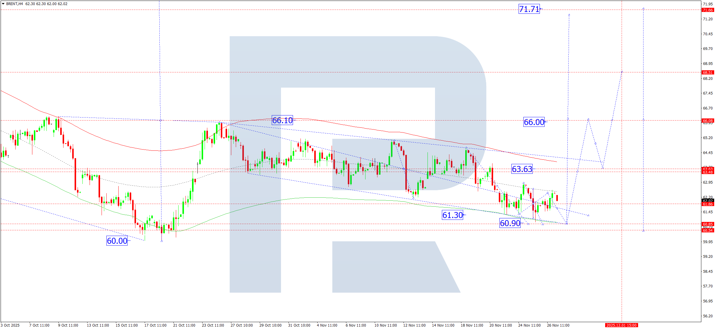 โครงสร้างคลื่น Elliott และเมทริกซ์ของคลื่นขาขึ้นที่มี pivot point ที่ 64.00 ยืนยันสถานการณ์นี้ และทำหน้าที่เป็นองค์ประกอบสำคัญสำหรับ Brent ในคลื่นนี้ ปัจจุบันตลาดกำลังก่อตัวกรอบการสะสมเหนือขอบล่างของ Price Envelope รอบ 61.86 หากราคาทะลุกรอบลง คลื่นอาจขยายลงไปถึงขอบล่างที่ 60.90 ในทางกลับกัน การทะลุกรอบขึ้นจะเปิดโอกาสให้เกิดคลื่นขาขึ้นไปยังขอบบนที่ 65.00