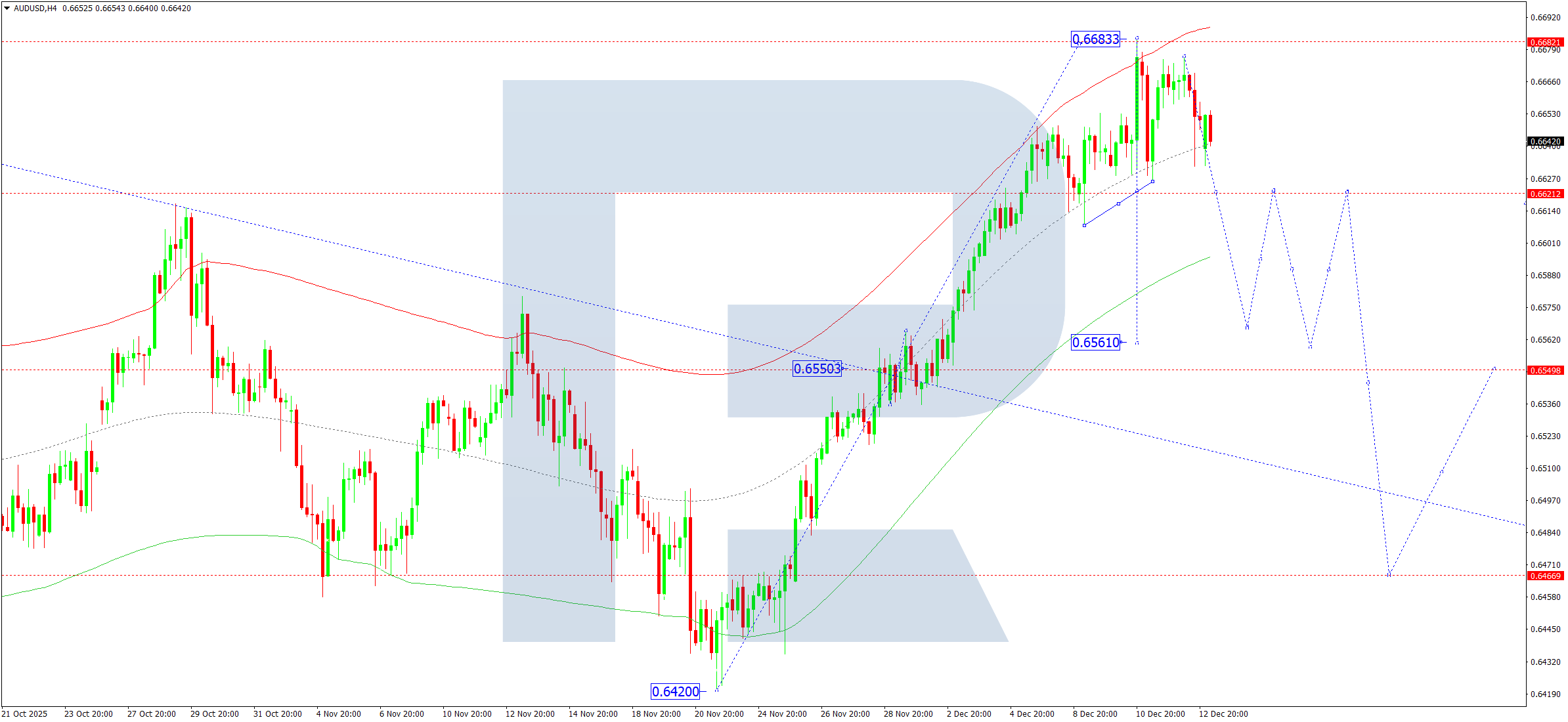 บนกราฟ H4 ของ AUDUSD ตลาดได้ทำคลื่นขาขึ้นเสร็จสมบูรณ์ไปที่ 0.6683 วันนี้ 15 ธันวาคม 2025 เราคาดว่าจะเริ่มต้นขาลงไปที่ 0.6622 (ทดสอบจากด้านบน) จากนั้น เราจะพิจารณาความเป็นไปได้ที่การปรับฐานจะขยายไปที่ 0.6555 หากราคาทะลุระดับนี้ จะเปิดโอกาสให้คลื่นขาลงดำเนินต่อไปที่ 0.6561