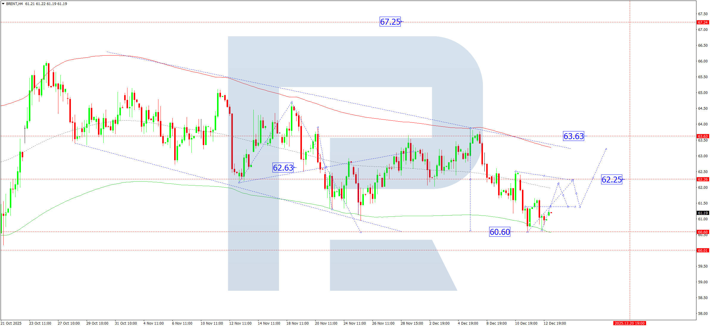 โครงสร้างคลื่น Elliott และ Matrix ของคลื่นขาขึ้นที่มี rotation centre ที่ 64.00 ยืนยันสถานการณ์นี้ และกำหนดให้เป็นโครงสร้างหลักสำหรับ Brent ขณะนี้ตลาดกำลังก่อตัวกรอบการสะสมเหนือขอบล่างของ Price Envelope ที่ 60.60 หากราคาทะลุขึ้น จะเปิดโอกาสให้เกิดคลื่นขาขึ้นไปยังขอบบนที่ 63.63