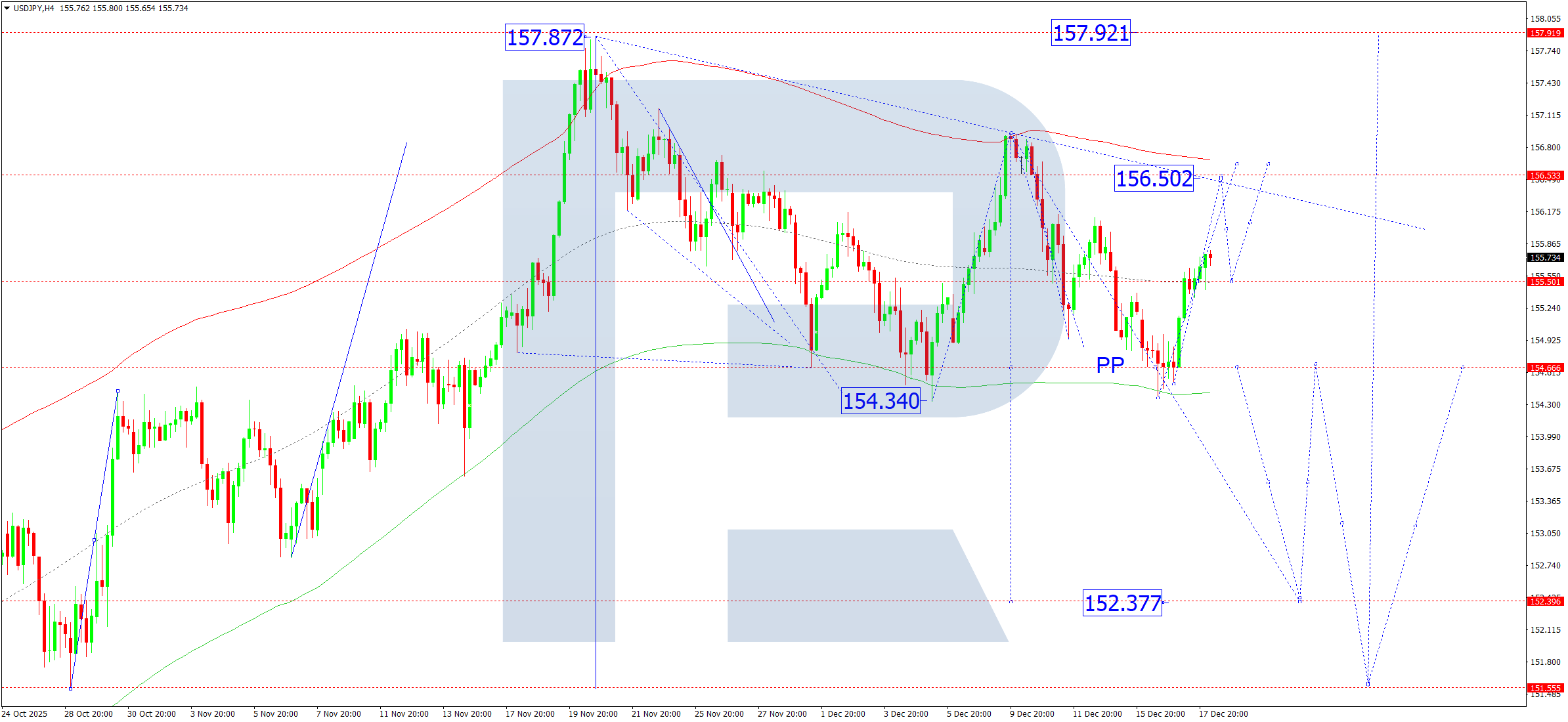 บนกราฟ H4 ของ USDJPY ตลาดได้ทำคลื่นขาขึ้นเสร็จสิ้นที่ระดับ 155.55 และก่อตัวกรอบการสะสมรอบระดับนี้ วันนี้ วันที่ 18 ธันวาคม 2025 พิจารณาความเป็นไปได้ของการทะลุกรอบขึ้นไปยังระดับ 156.50 ต่อมา จะพิจารณาความเป็นไปได้ของการปรับตัวลงสู่ระดับ 155.50