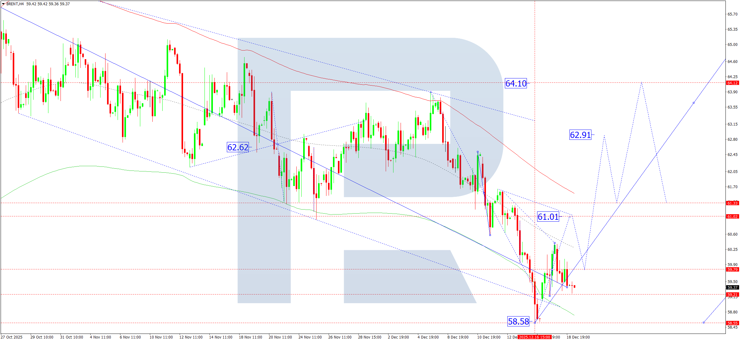 บนกราฟ H4 ของน้ำมันดิบ Brent ตลาดกำลังก่อตัวกรอบการสะสมรอบระดับ 59.79 วันนี้ วันที่ 19 ธันวาคม 2025 มีความเป็นไปได้ของการปรับตัวลงสู่ระดับ 58.90 ต่อมา คาดว่าจะเกิดแรงกระตุ้นขาขึ้นไปยังระดับ 61.00 พร้อมแนวโน้มที่อาจดำเนินต่อไปยังระดับ 62.90 และต่อเนื่องไปถึงระดับ 64.10 ซึ่งเป็นเป้าหมายแรก