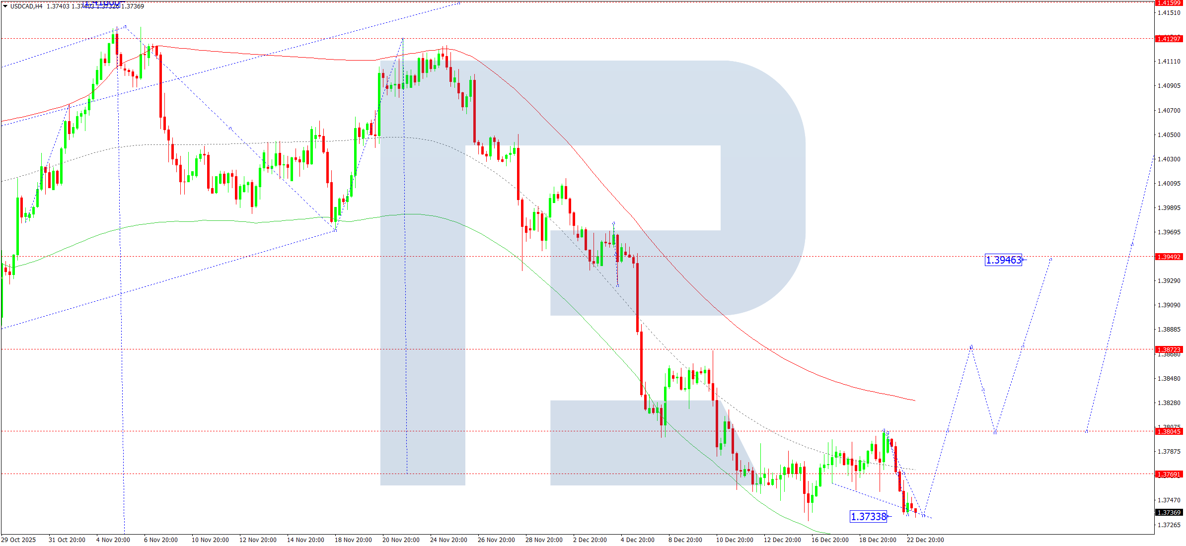 บนกราฟ H4 ของ USDCAD ตลาดยังคงก่อตัวช่วงการแกว่งตัวแบบสะสมกำลังบริเวณระดับ 1.3770 วันนี้ 23 ธันวาคม 2025 เราคาดว่าช่วงดังกล่าวจะขยายตัวลงไปยัง 1.3733 หลังจากนั้น เราจะพิจารณาความเป็นไปได้ของการเกิดคลื่นขาขึ้นรอบใหม่ไปยัง 1.3805 หากระดับนี้ถูกทะลุขึ้น คลื่นอาจเคลื่อนไหวต่อเนื่องไปยัง 1.3873